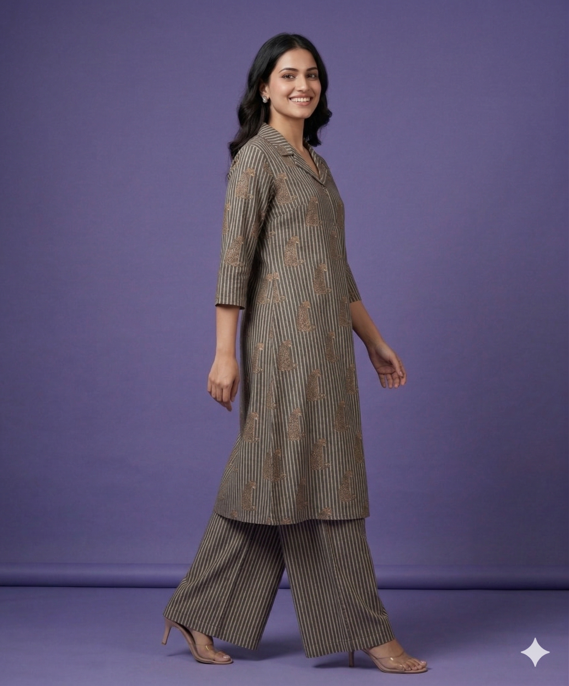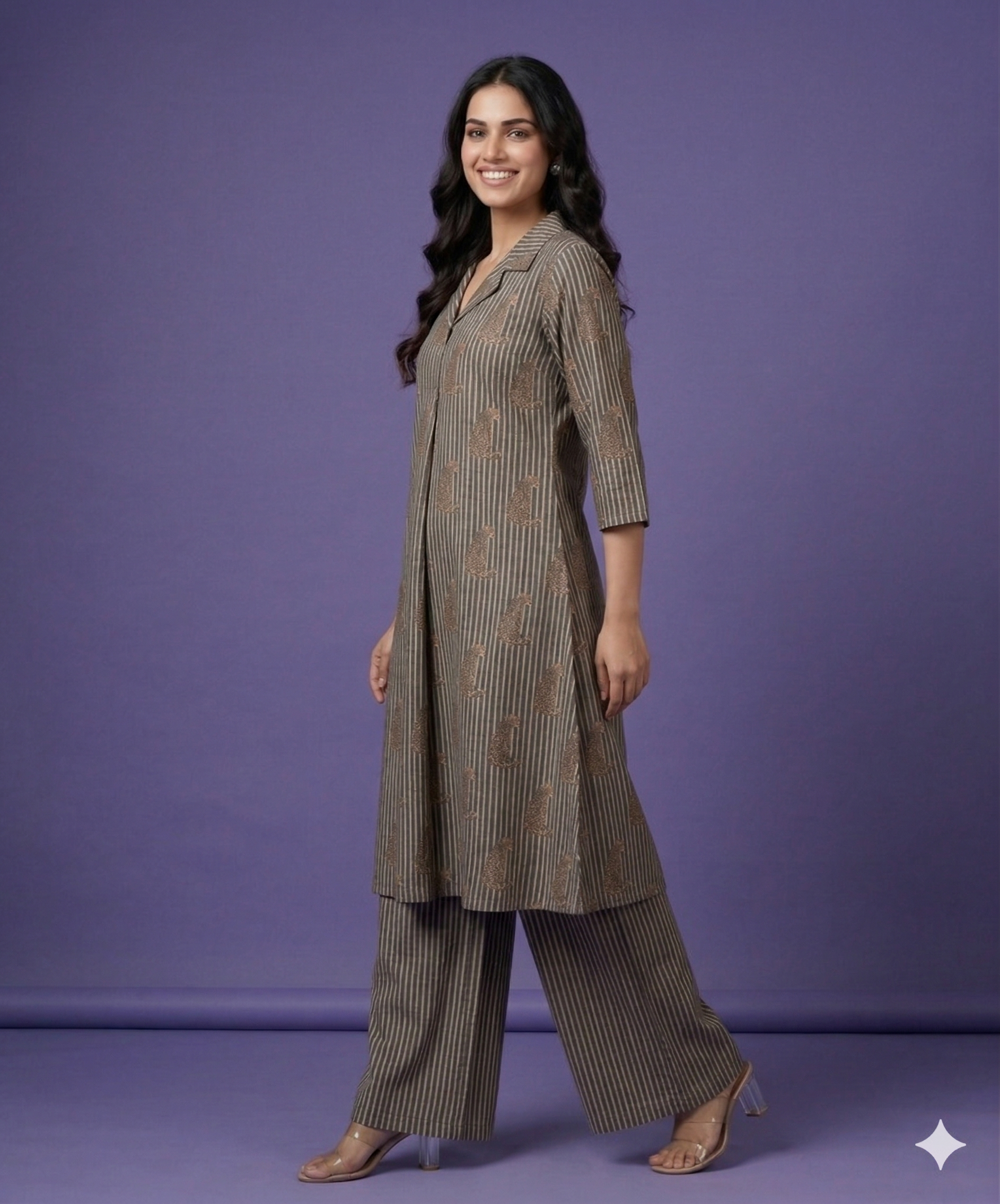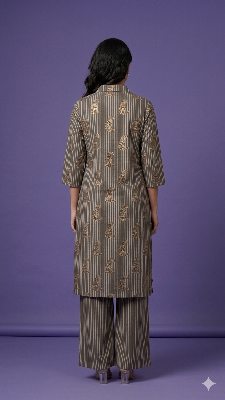 Upgrade your everyday style with this black collared cotton co-ord set, designed for comfort and a smart casual look. The A-line printed top adds a modern touch, perfectly paired with matching palazzo for a relaxed yet stylish fit. Ideal for daily wear, office looks, or casual outings with effortless elegance.