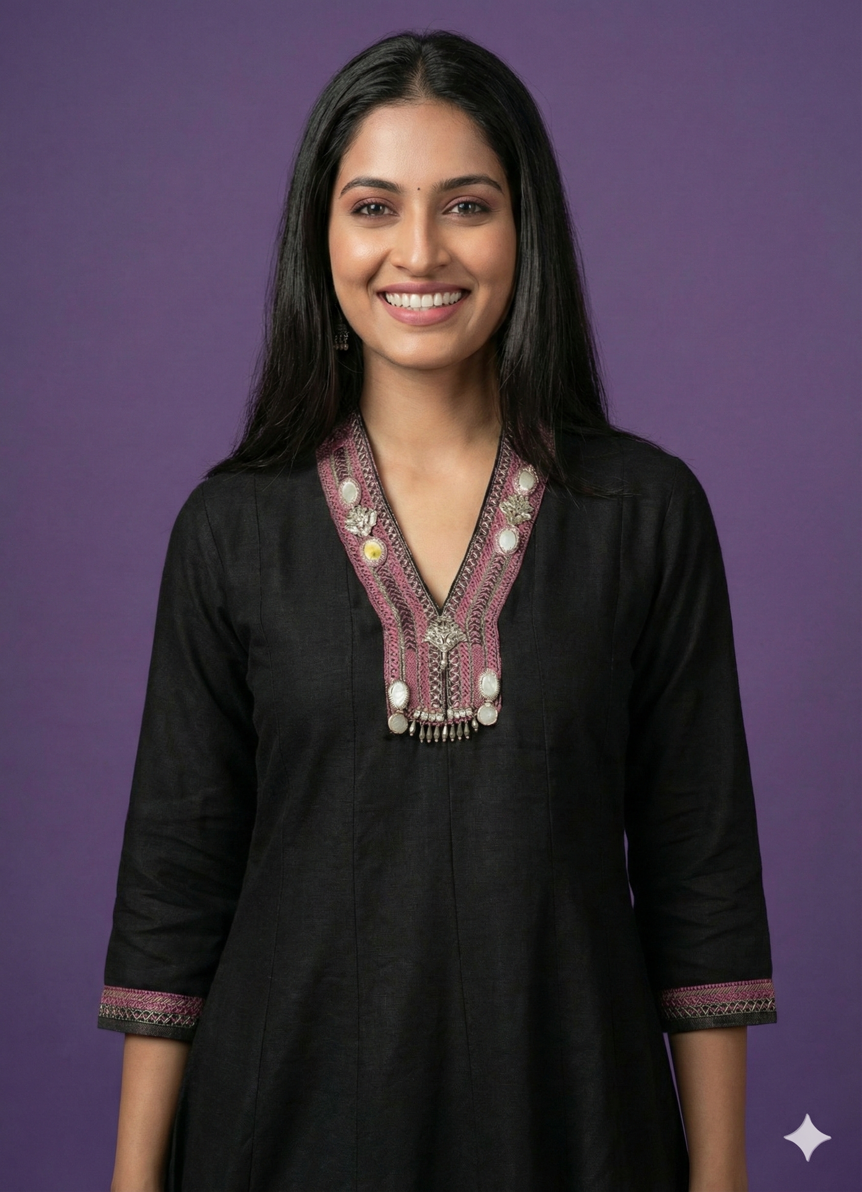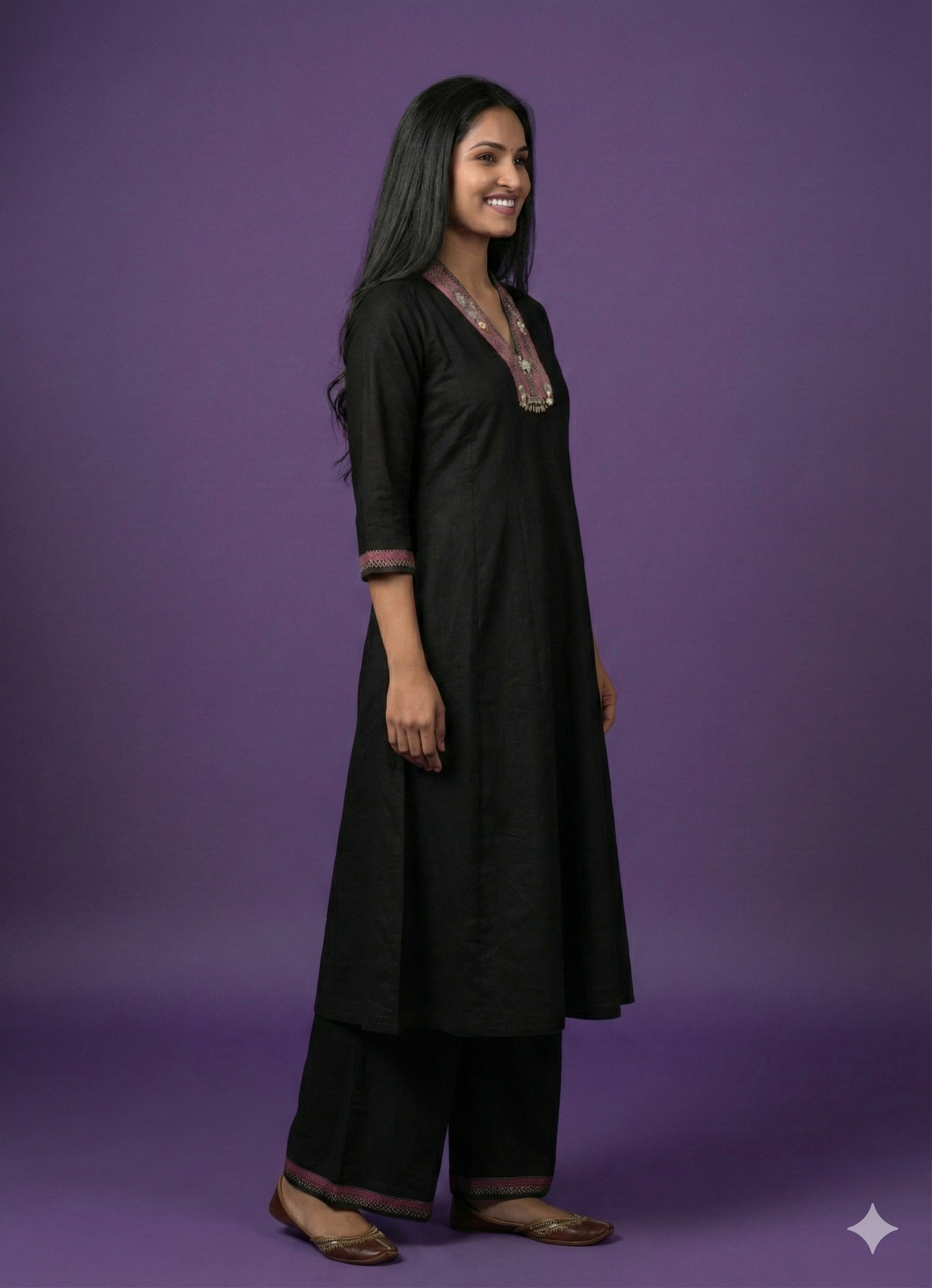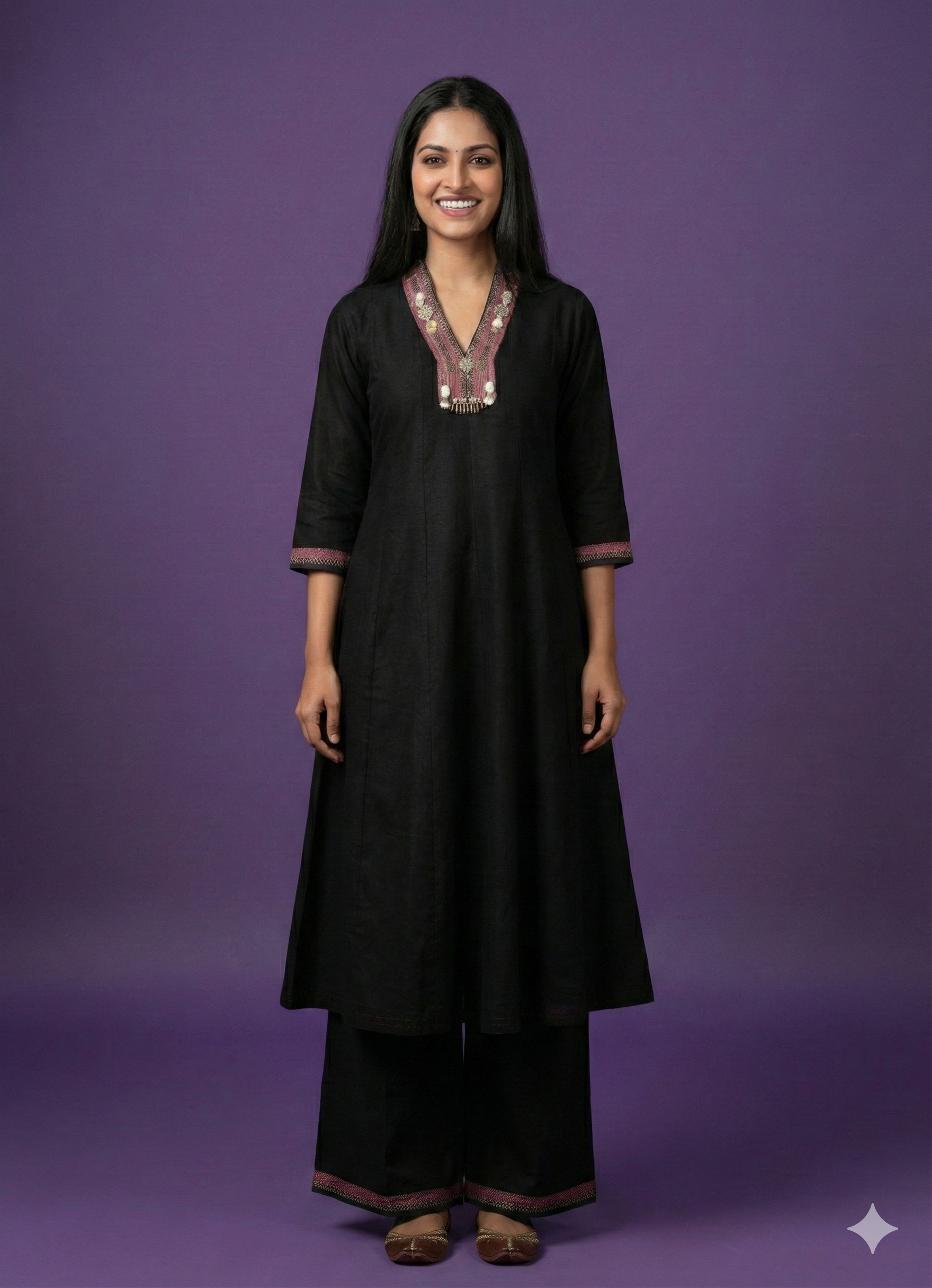 Step into effortless elegance with this black V-neck silk kurta set, designed for a graceful yet casual look. The kali-style silhouette adds beautiful flare and movement, creating a flattering and flowy fit. Crafted from smooth silk fabric, this set blends everyday comfort with timeless sophistication.