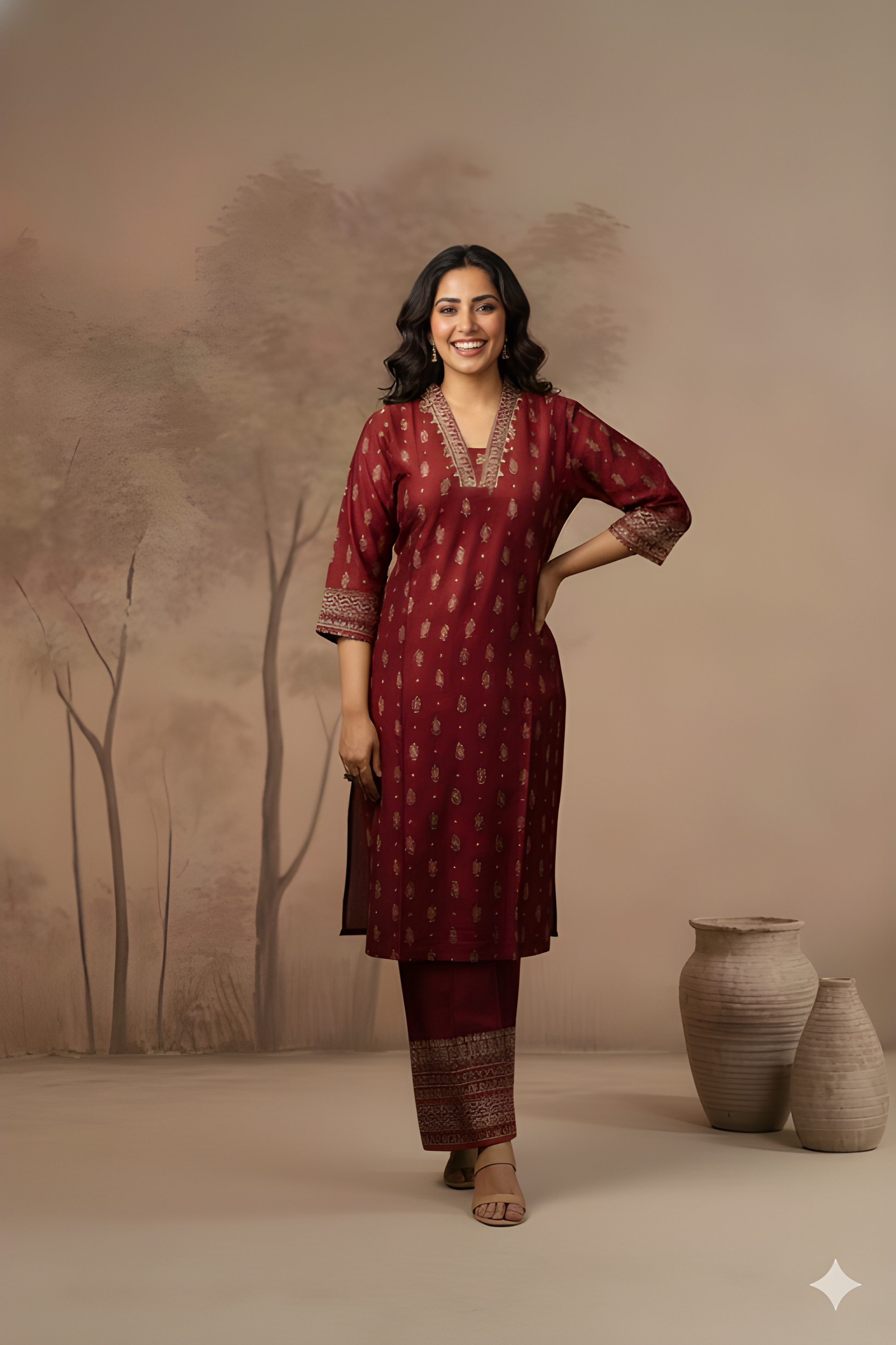 This rich burgundy cord set features a bold deep V neckline that adds a touch of contemporary elegance. Crafted from premium silk, it offers a smooth texture and luxurious sheen. The coordinated top and bottom create a sleek, festive-ready look perfect for celebrations or evening outings.