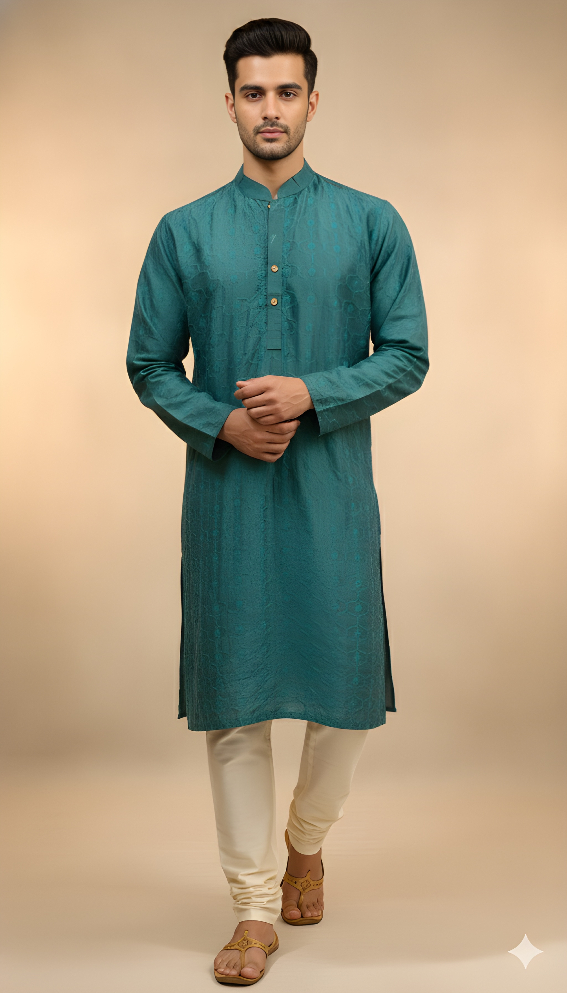 This green silk kurta features a smart mandarin neckline that adds a modern touch to its classic silhouette. The smooth silk fabric gives it a soft shine and comfortable feel. Designed as a casual wear piece, it offers an elegant yet easy-going look suitable for everyday styling or relaxed gatherings. A versatile kurta that pairs well with matching or contrasting bottoms.