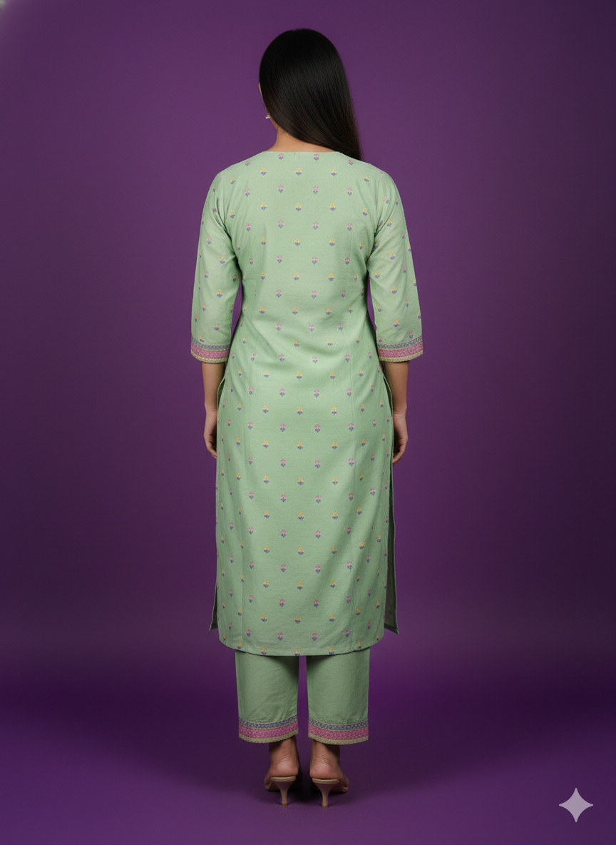 This festive silk cord set features a rich green hue that brings elegance to any celebration. The classic V-neckline adds a refined and stylish touch. Crafted in smooth silk, it offers a graceful festive look with a modern appeal.