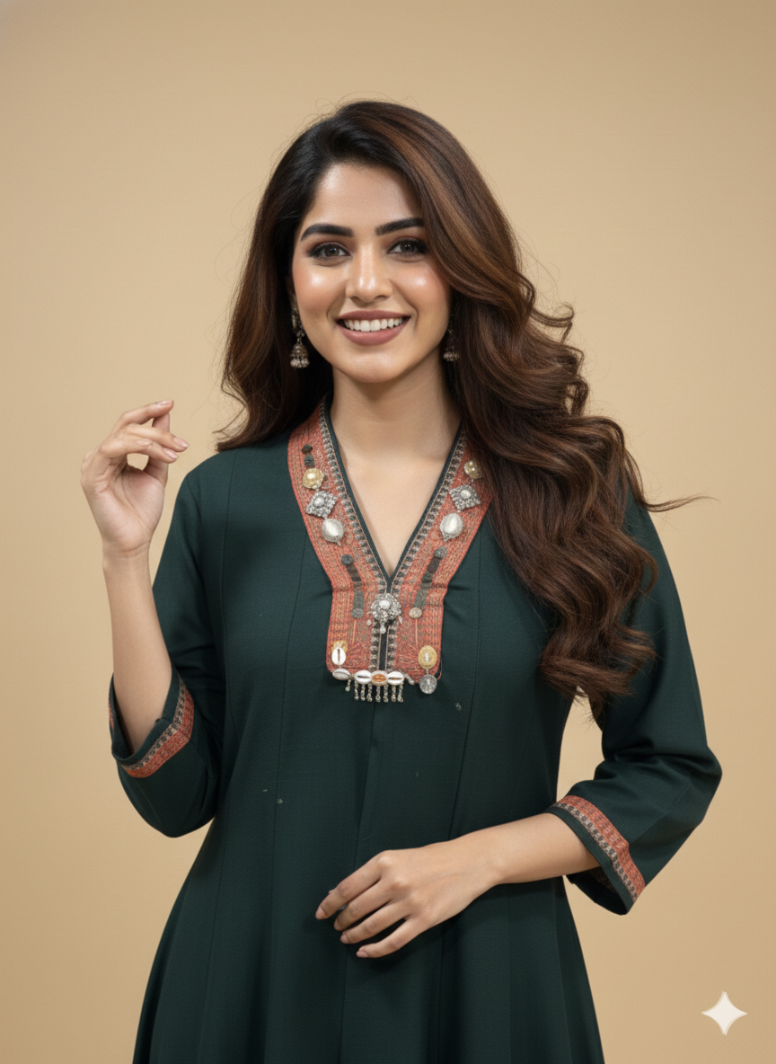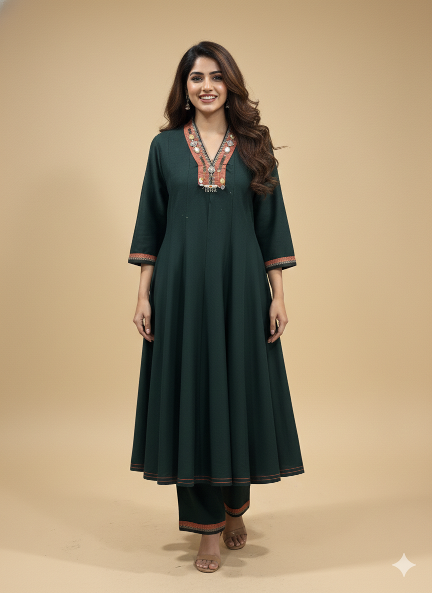 Add effortless elegance to your everyday style with this Green V-Neck Silk Kali Kurta Set. Crafted from smooth, lightweight silk fabric, the kurta features a flattering kali silhouette that offers graceful movement and a relaxed fit. The V-neck is beautifully enhanced with intricate ethnic detailing, adding a statement touch while keeping the look casual and versatile. Ideal for daily wear, casual outings, or daytime gatherings.