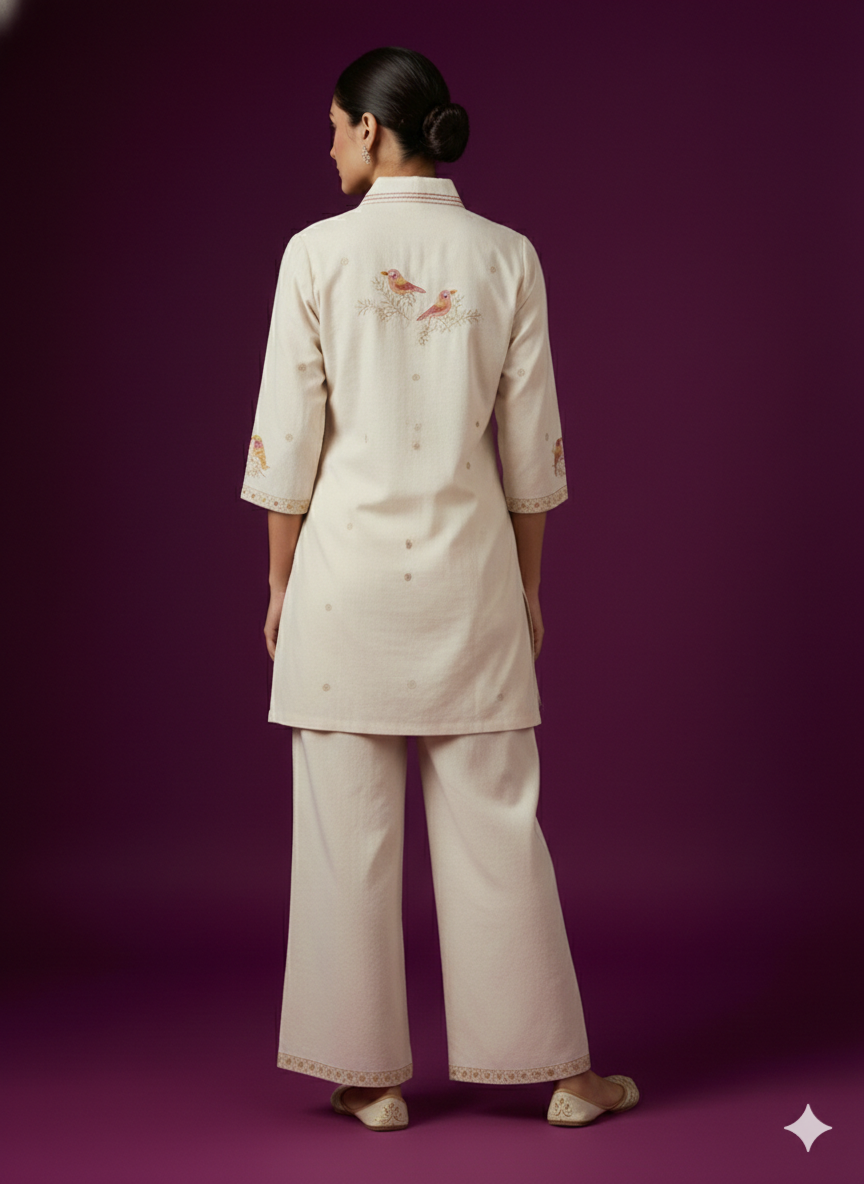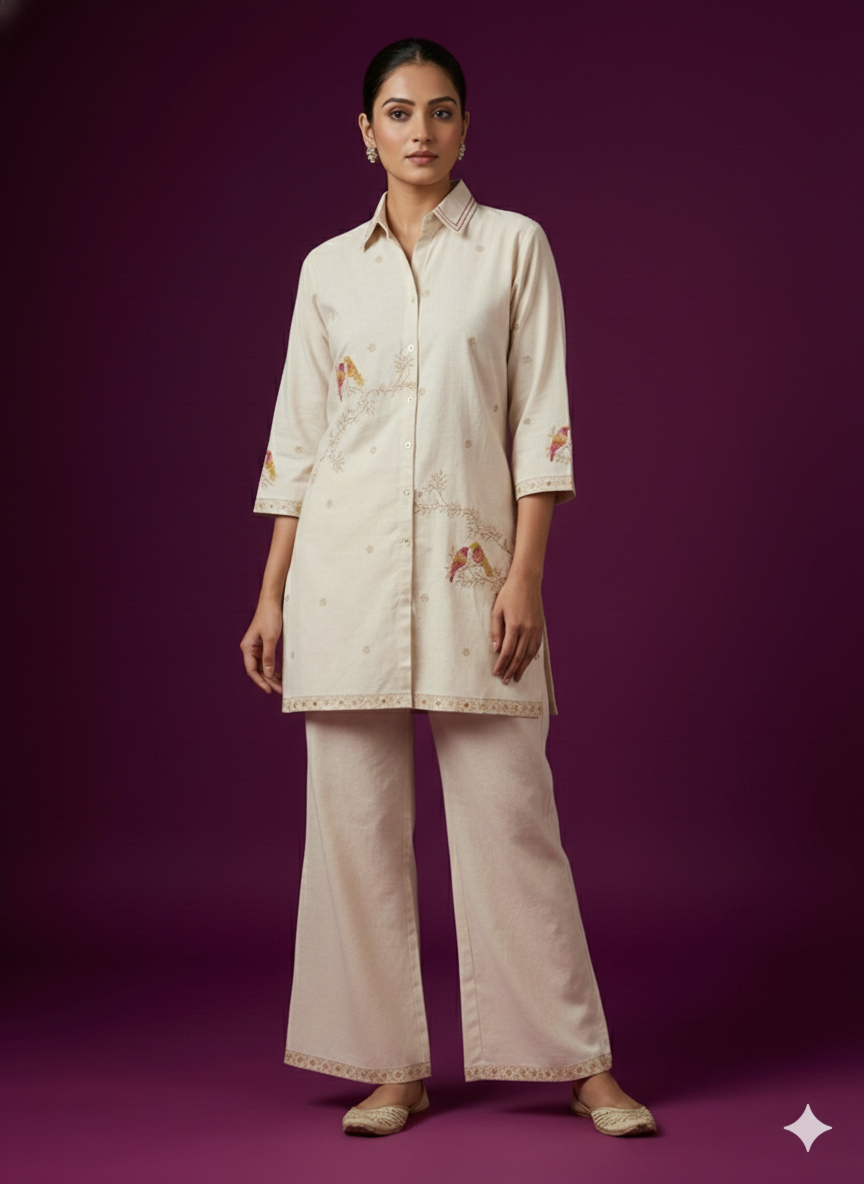 Stay comfortable and stylish with this ivory cotton cord set. Featuring a classic collared design, it’s perfect for casual outings or relaxed everyday wear. Lightweight and breathable, it combines effortless style with all-day comfort.