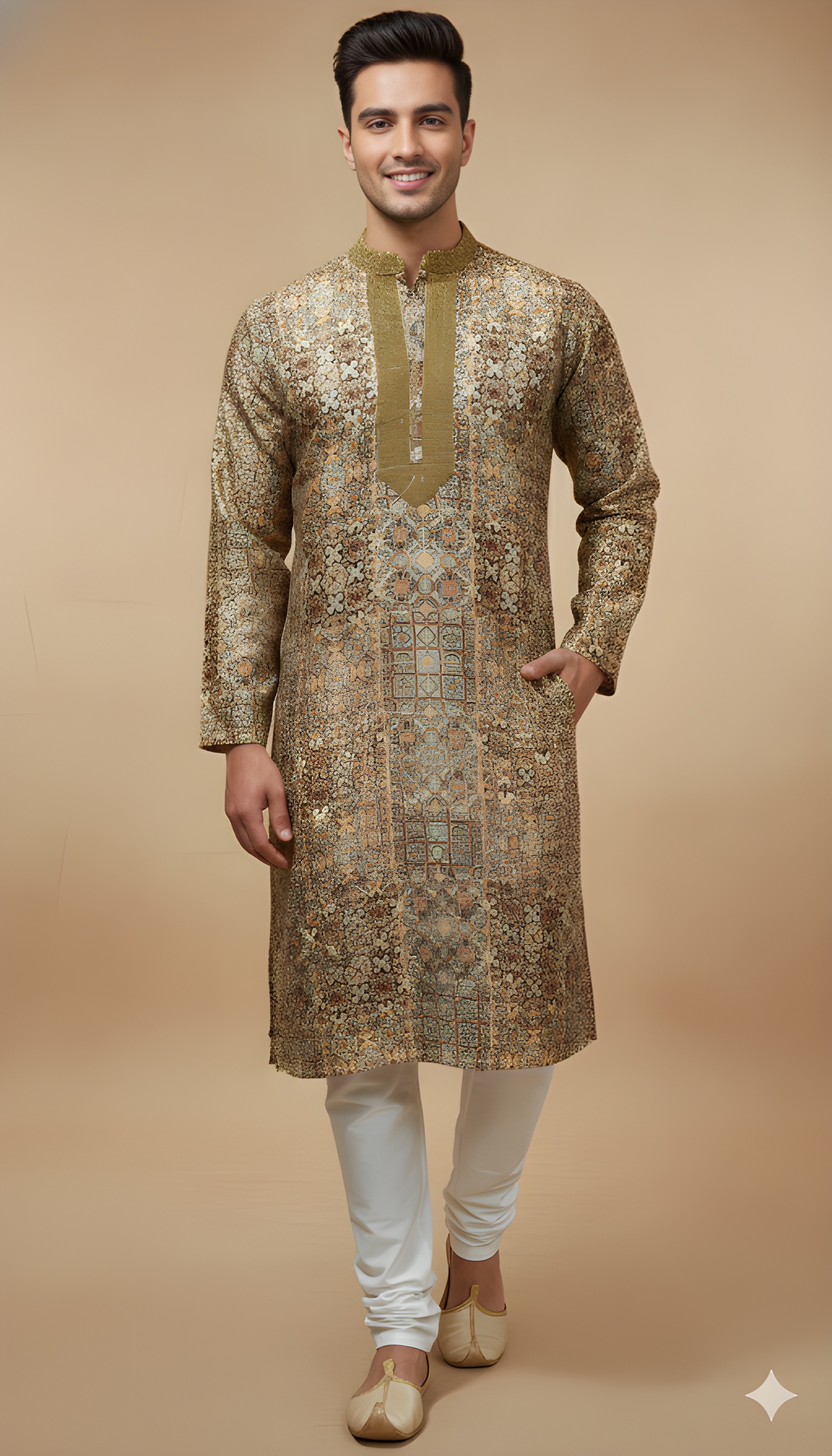 Step into celebrations with grace in this Ivory Mandarin Neck Silk Kurta, crafted from premium silk that offers a soft sheen and luxurious feel. The subtle festive print enhances its refined charm, making it perfect for cultural events, family functions, and festive occasions. The classic mandarin neckline adds a modern traditional touch, creating a timeless and stylish look for any celebration.