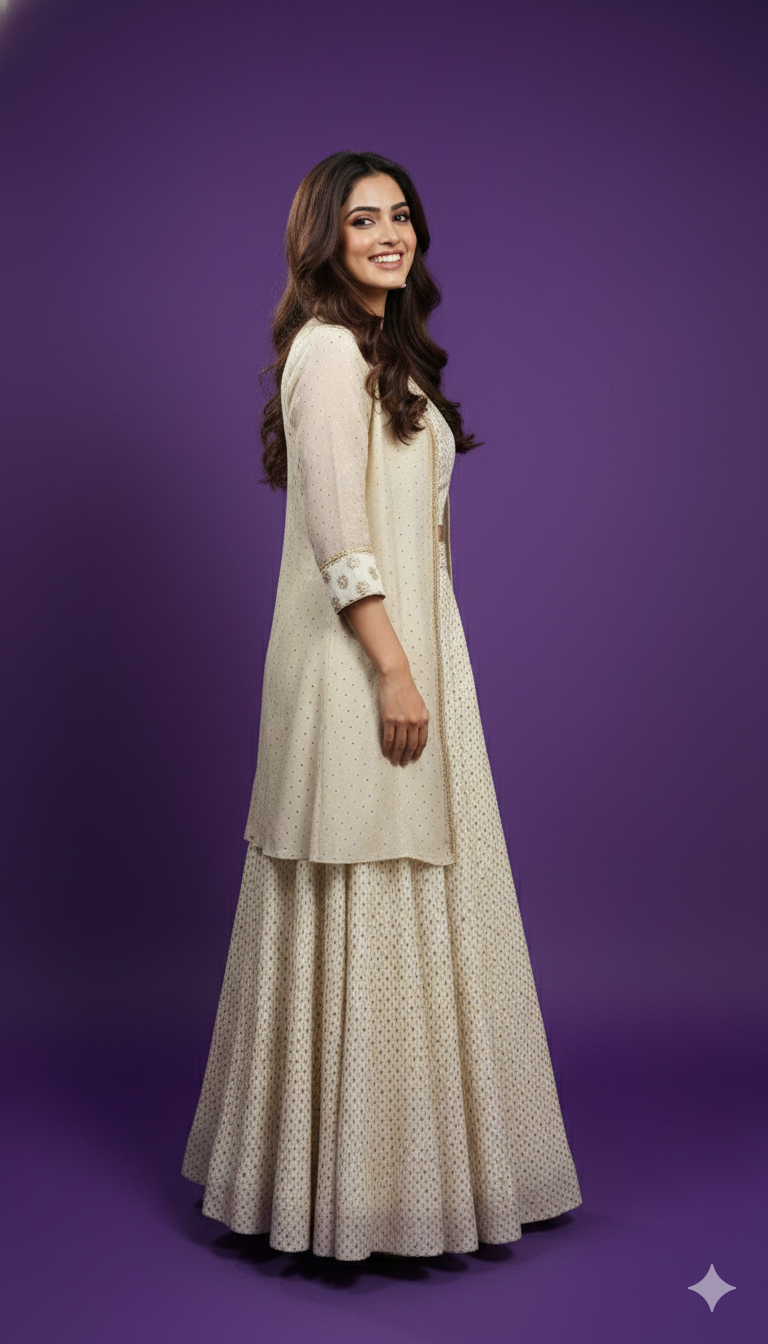 Grace your festive wardrobe with this elegant Ivory Round V-Neck Silk 3-Piece Set, crafted in luxurious silk for a rich and refined look. The round V-neckline is beautifully enhanced with delicate embroidery lace, adding a subtle festive charm. Paired with a flowing skirt and a matching jacket, this ensemble offers effortless elegance, making it perfect for festive celebrations and special occasions.