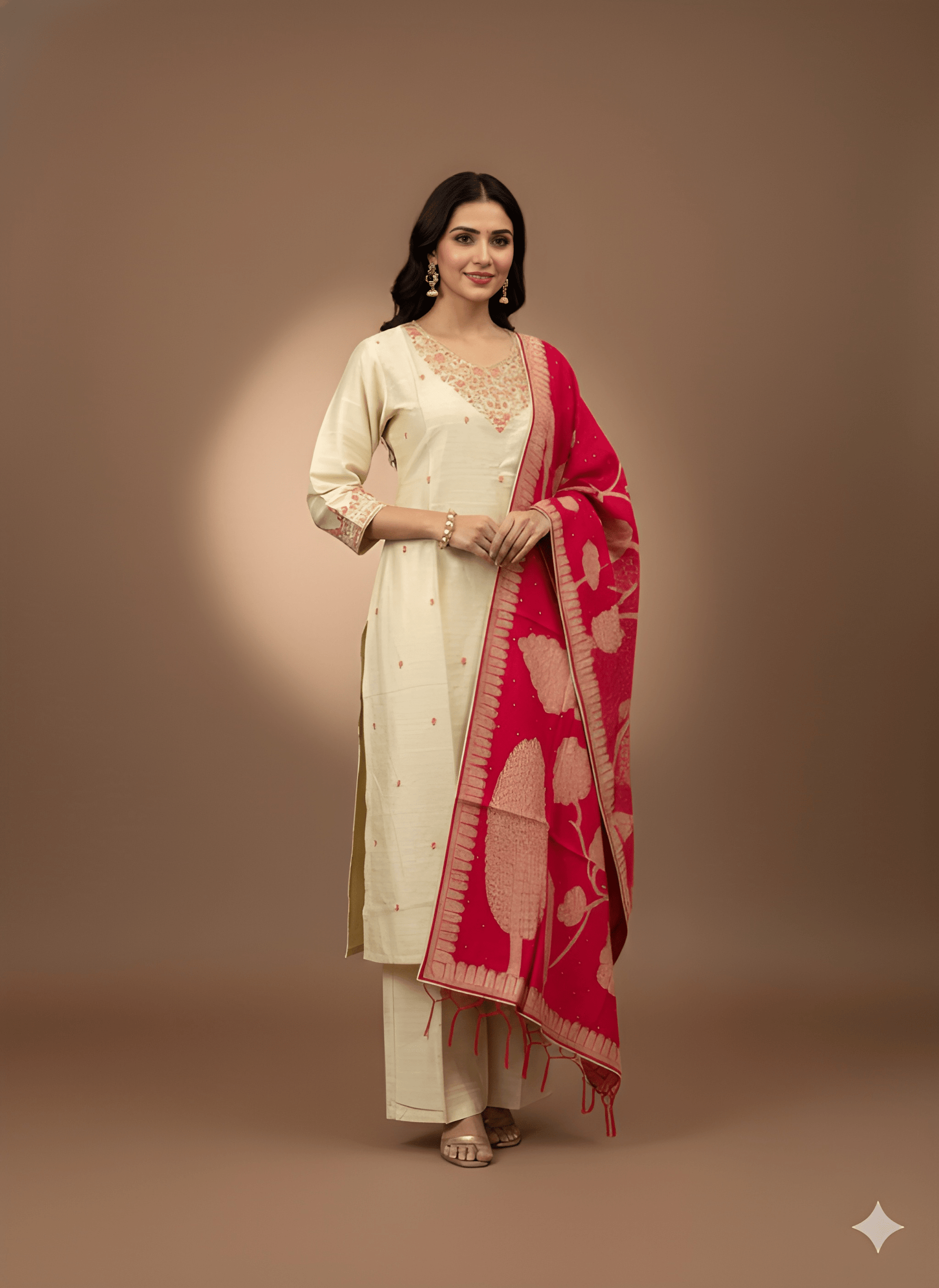 Ivory Round V Neck Viscose Kurta Set with Dupatta