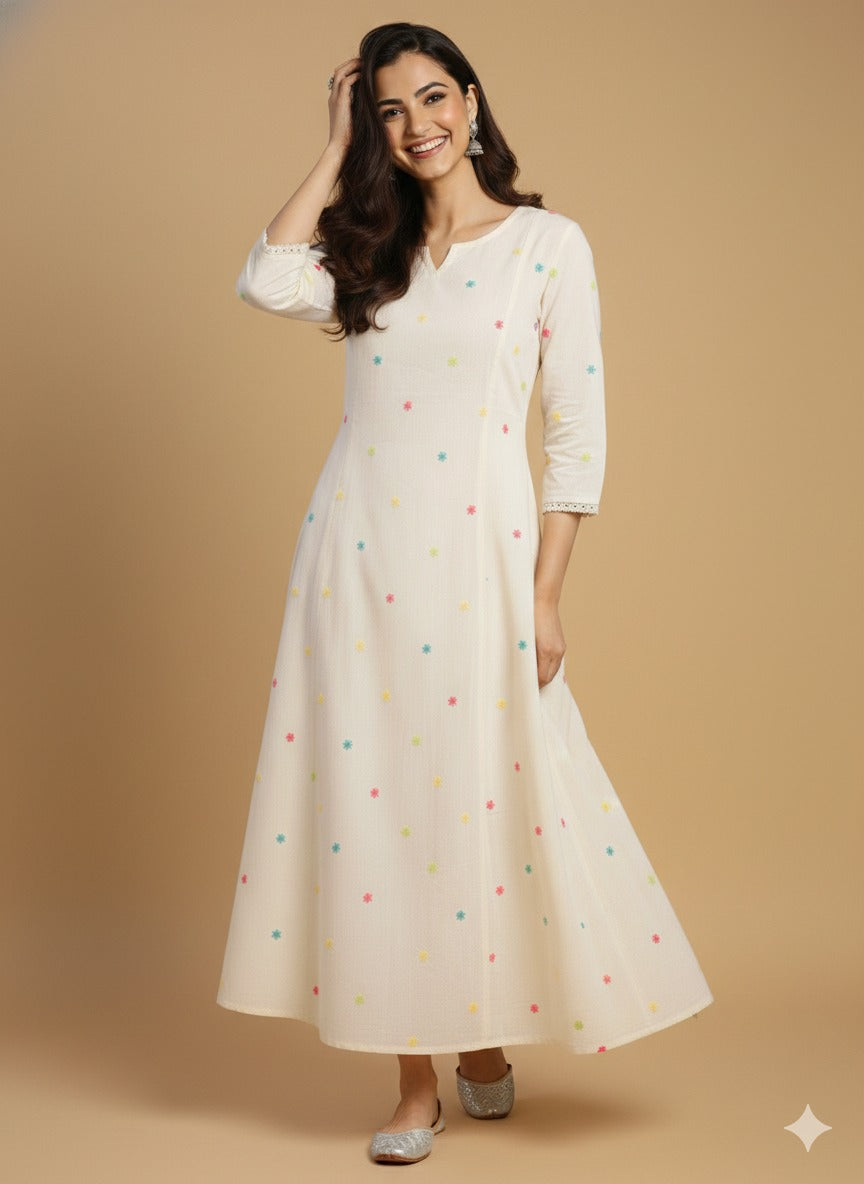 This ivory V-neck cotton kurta is a perfect blend of comfort and effortless style for everyday wear. Crafted from soft, breathable cotton, it features delicate multicolor embroidered motifs that add a subtle charm to its elegant look. The three-quarter sleeves with lace detailing and the flowy silhouette create a flattering and graceful fit. Ideal for casual outings or workdays, it pairs beautifully with leggings or straight pants for a relaxed yet refined outfit.