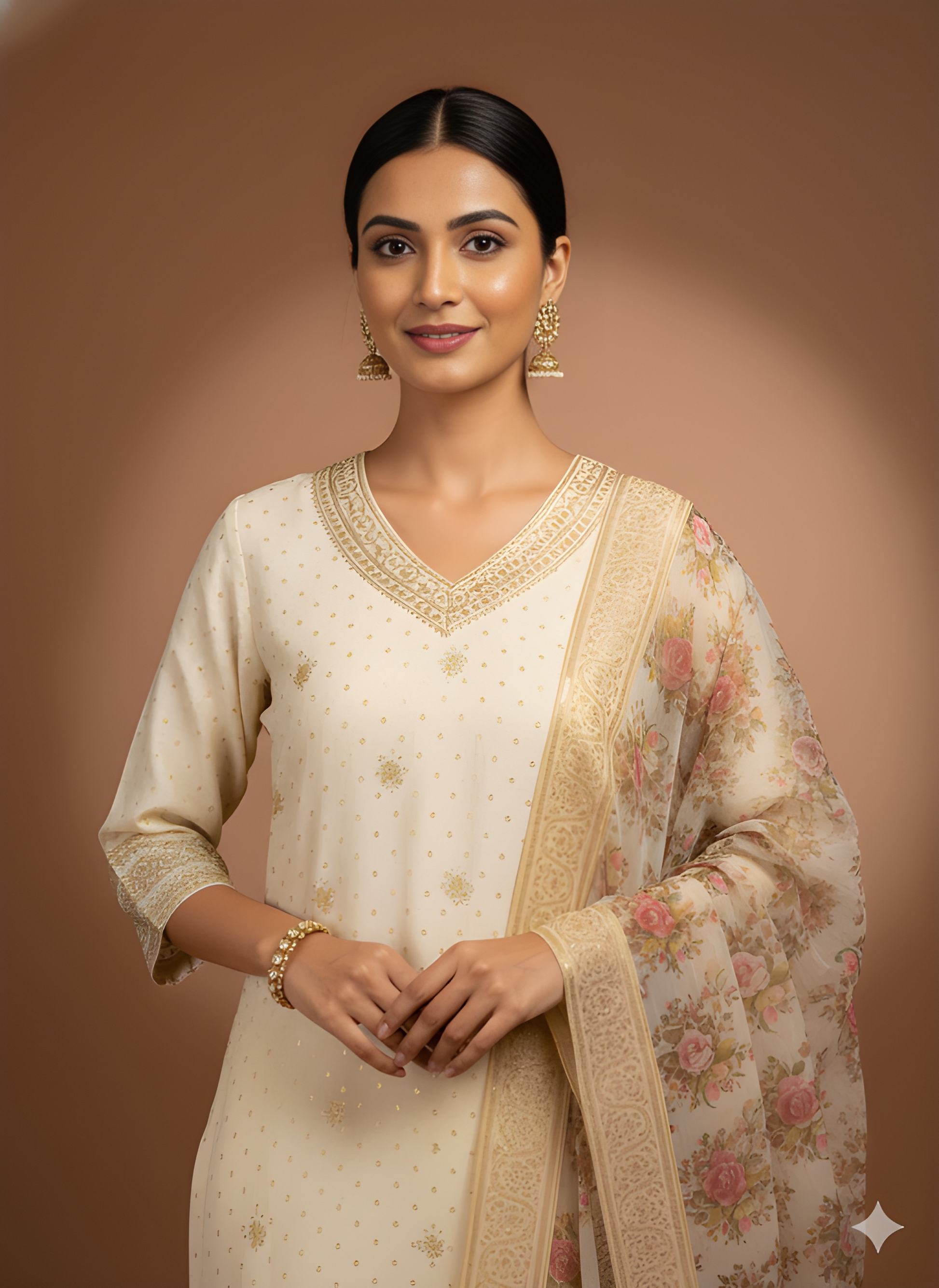 Ivory V Neck Cotton Kurta Set with Dupatta