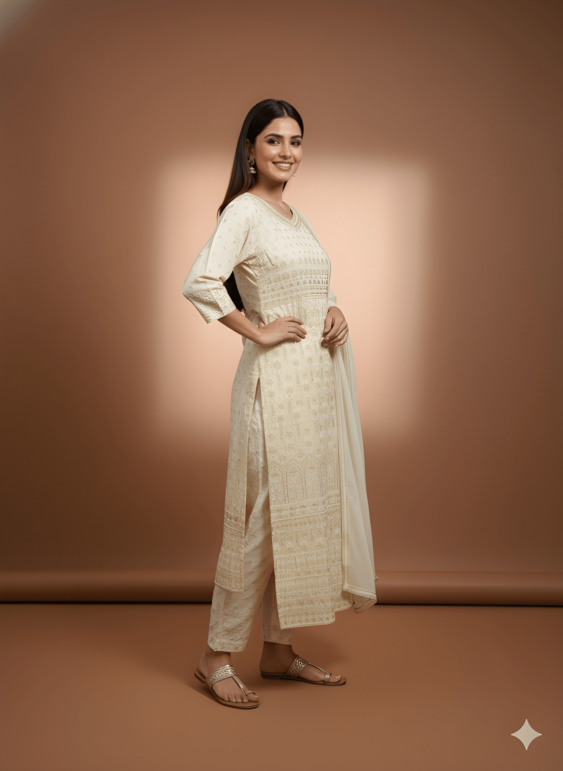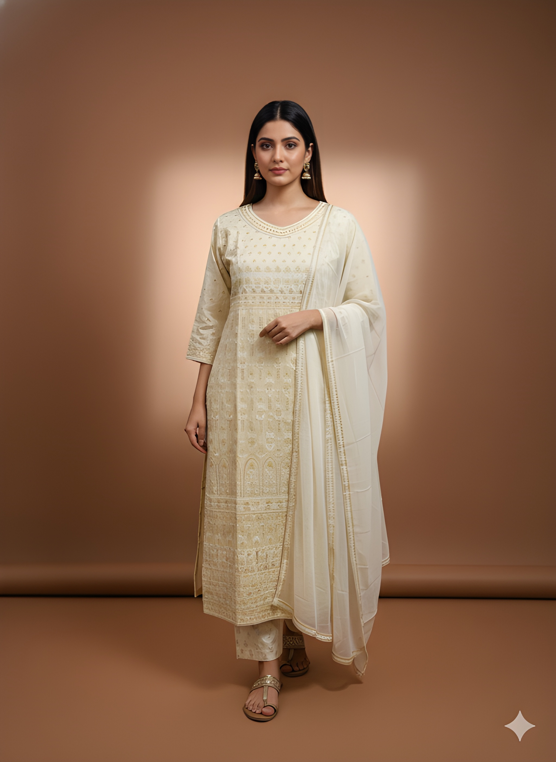 This elegant kurta set is crafted in premium silk, featuring a refined V-neckline with delicate embroidery detailing. The ivory shade adds a soft, graceful charm perfect for festive and special occasions. Paired with a matching dupatta, it completes a sophisticated and timeless look.