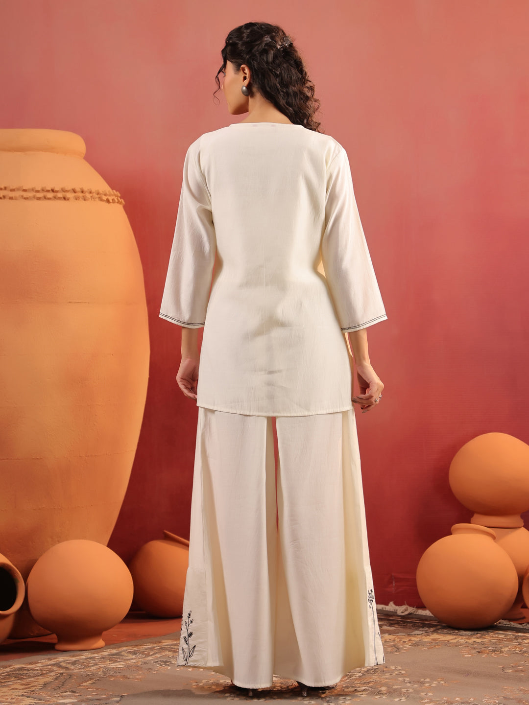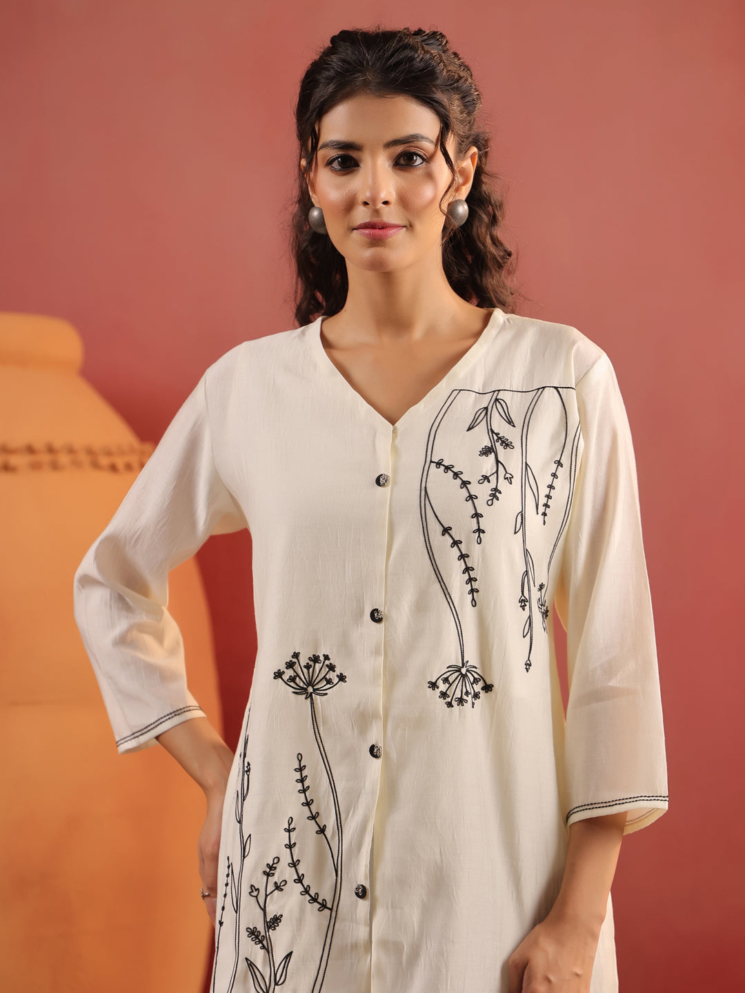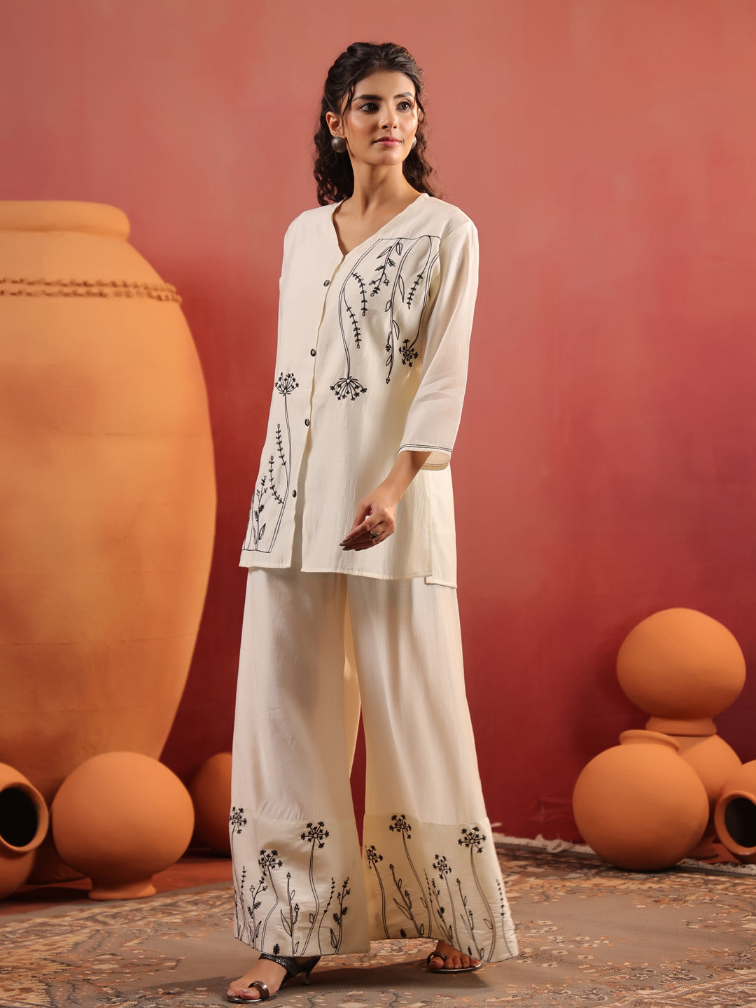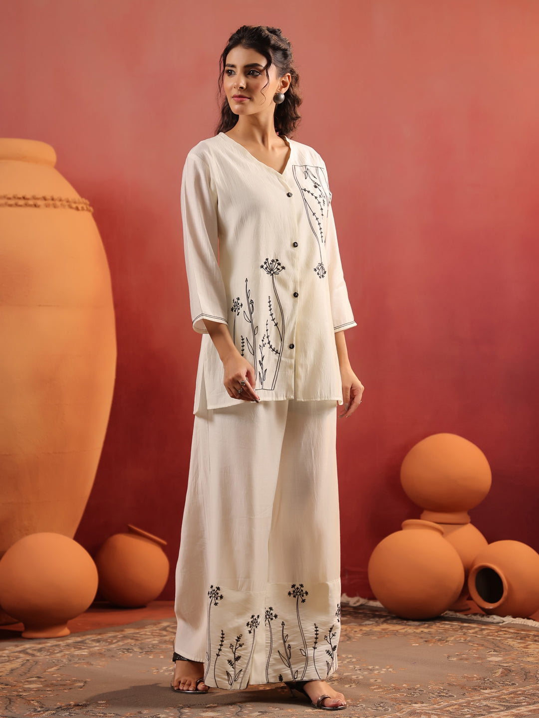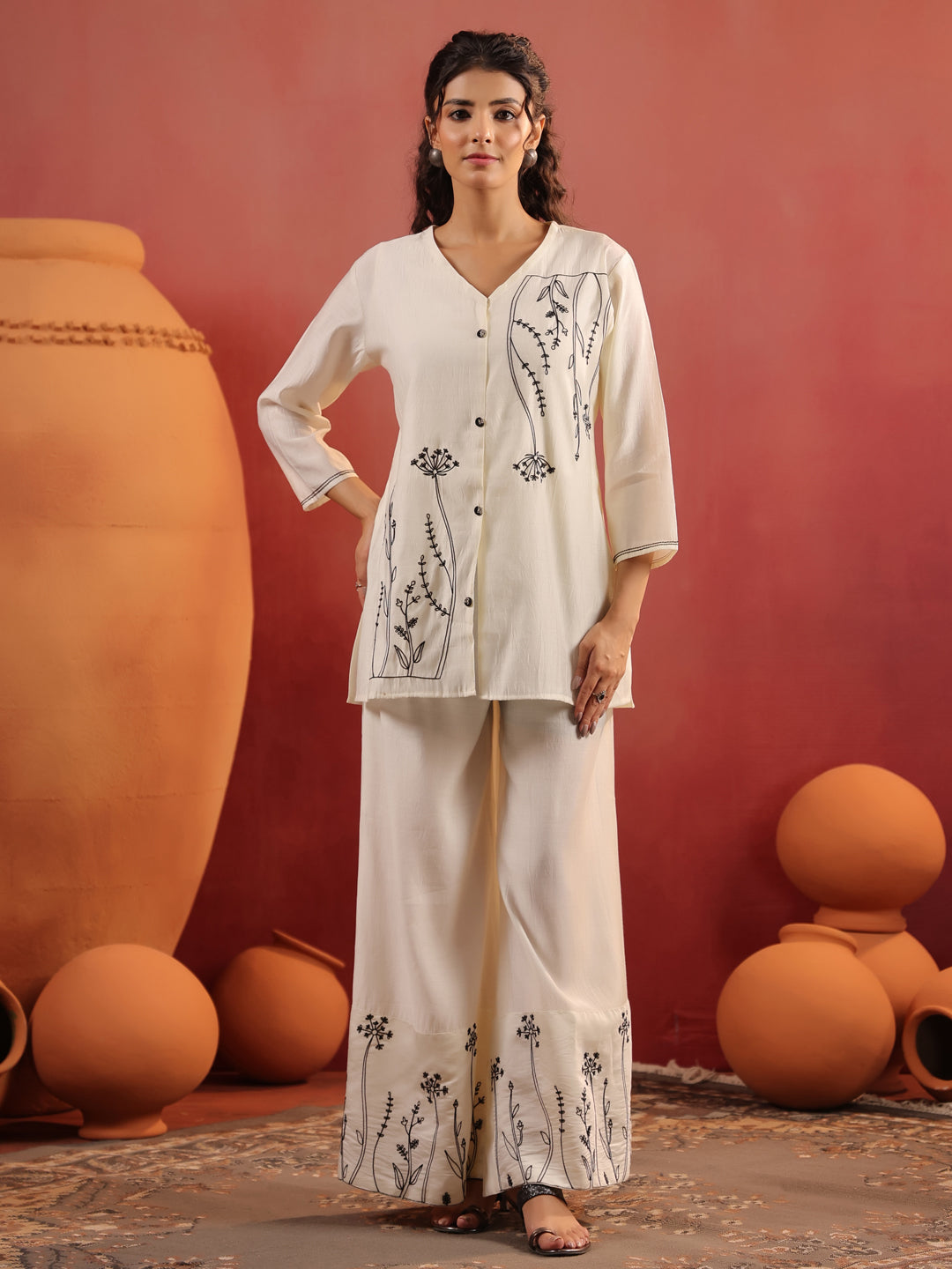 Add understated elegance to your everyday wardrobe with this off-white V-neck silk cord set. Crafted from smooth and lightweight silk fabric, the kurta features a flattering V neckline and a relaxed silhouette for all-day comfort. Paired with coordinated bottoms, this casual set is perfect for office wear, daytime outings, or effortless daily styling with a refined touch.