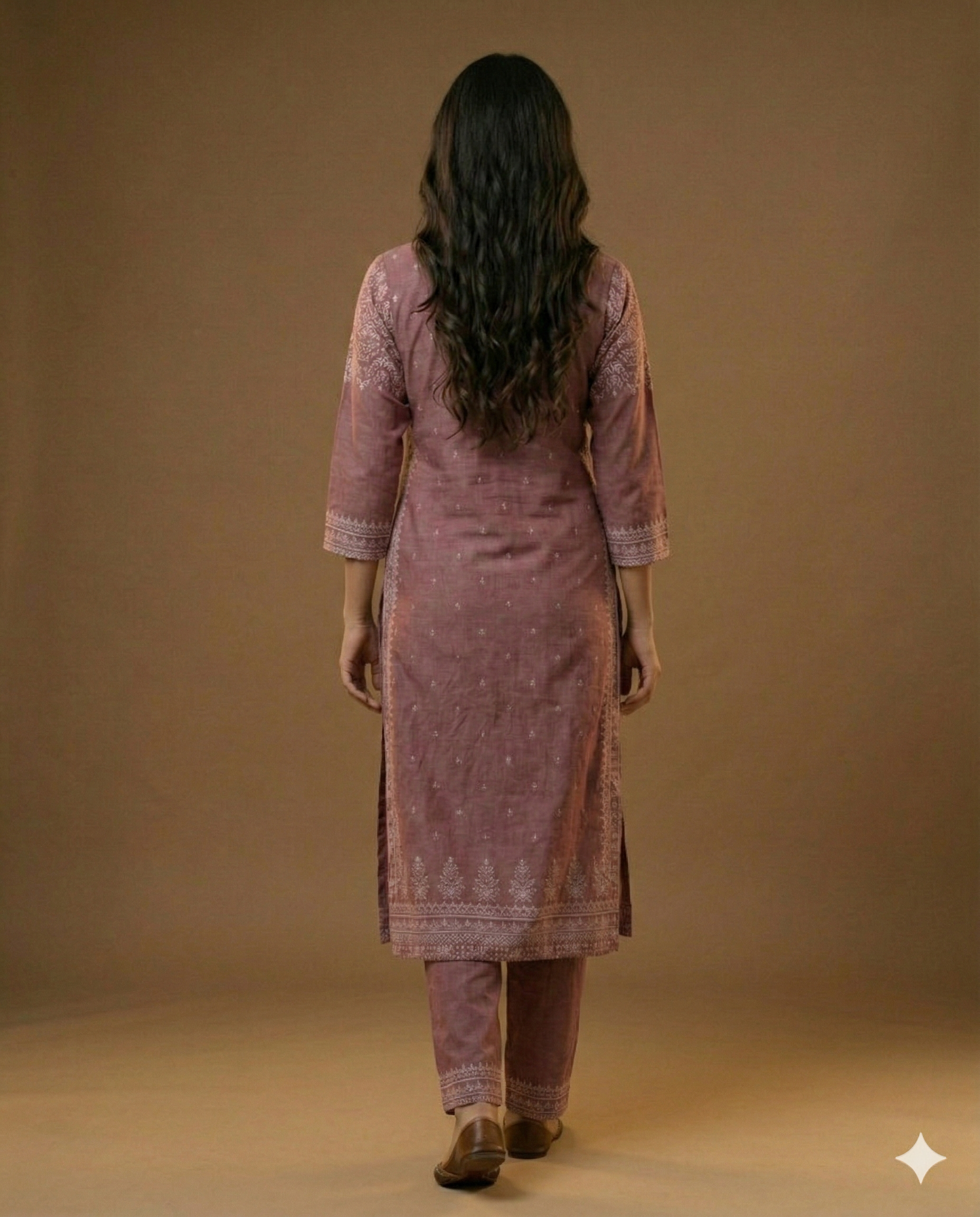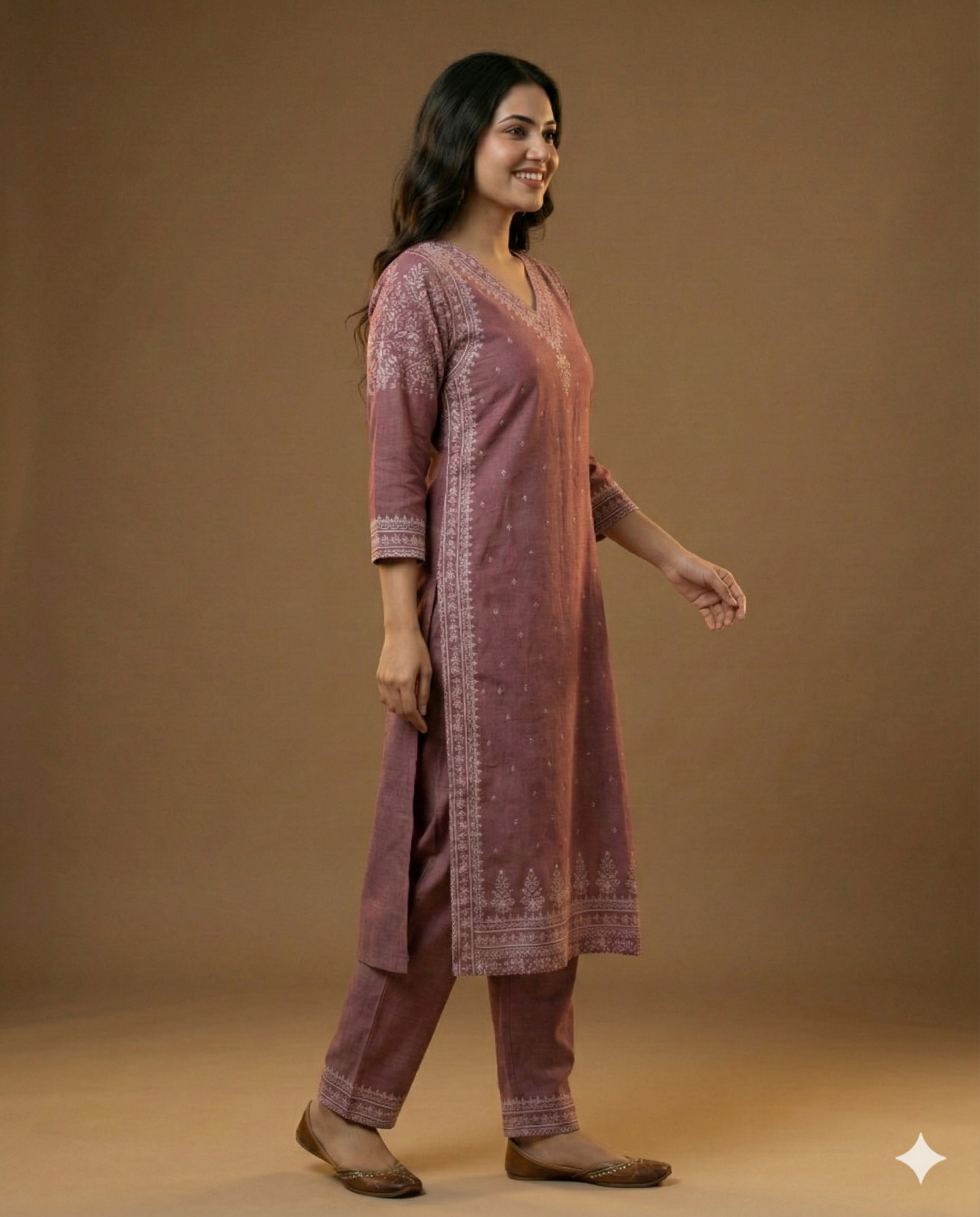 Upgrade your everyday wardrobe with this Pink V-Neck Cotton Cord Set, designed for effortless casual style. Made from soft and breathable cotton fabric, this set ensures all-day comfort. The kurta features elegant white printed designs and a flattering V-neckline that adds a stylish touch. Perfect for daily wear, this coordinated set offers a chic and comfortable look.