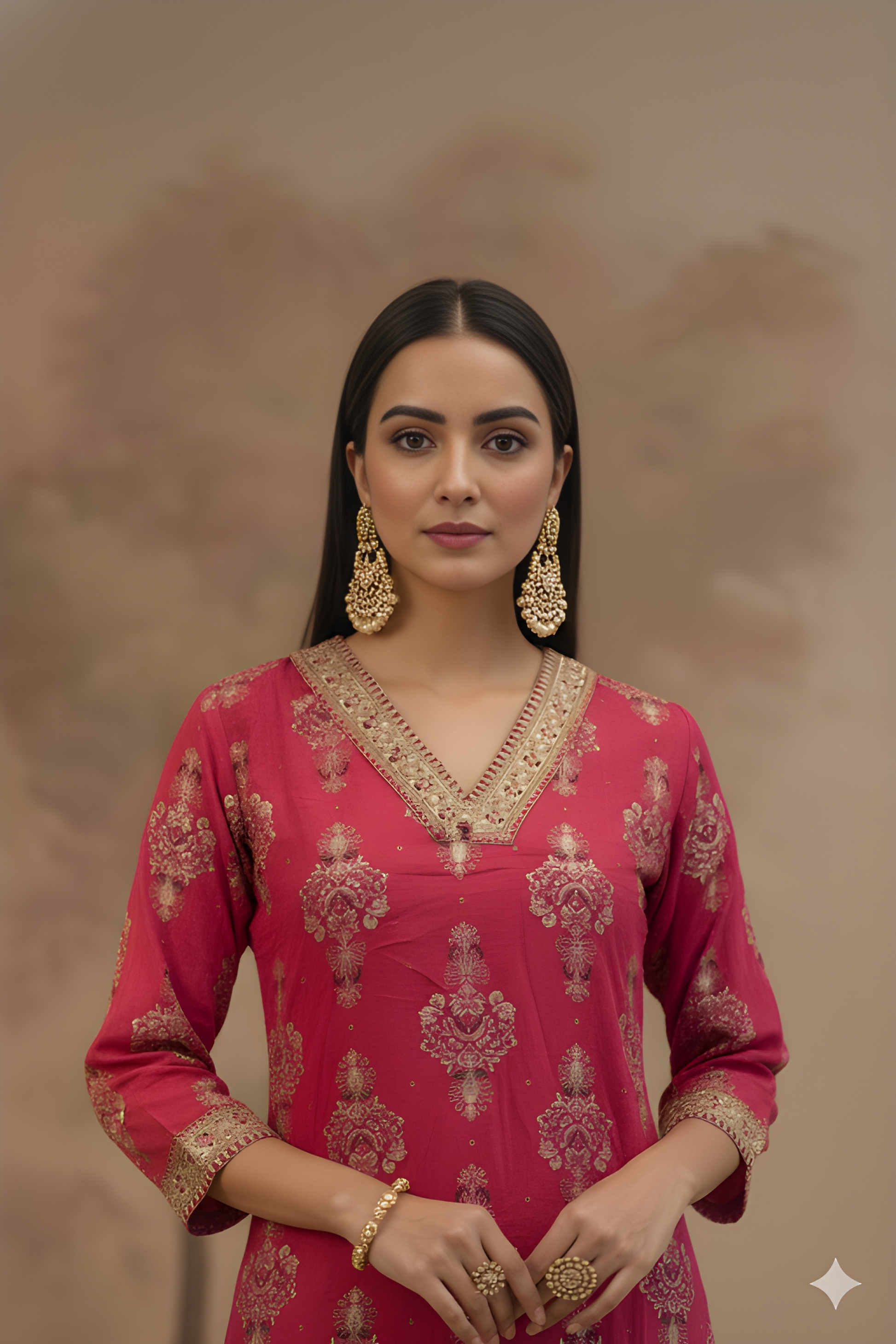 This elegant pink cord set is crafted in soft, flowy rayon and designed with a flattering V-neckline that adds a festive charm. The coordinating palazzo bottom enhances comfort while giving a stylish, graceful look. Perfect for festive occasions, celebrations, or special gatherings, this set blends comfort with a refined ethnic touch.