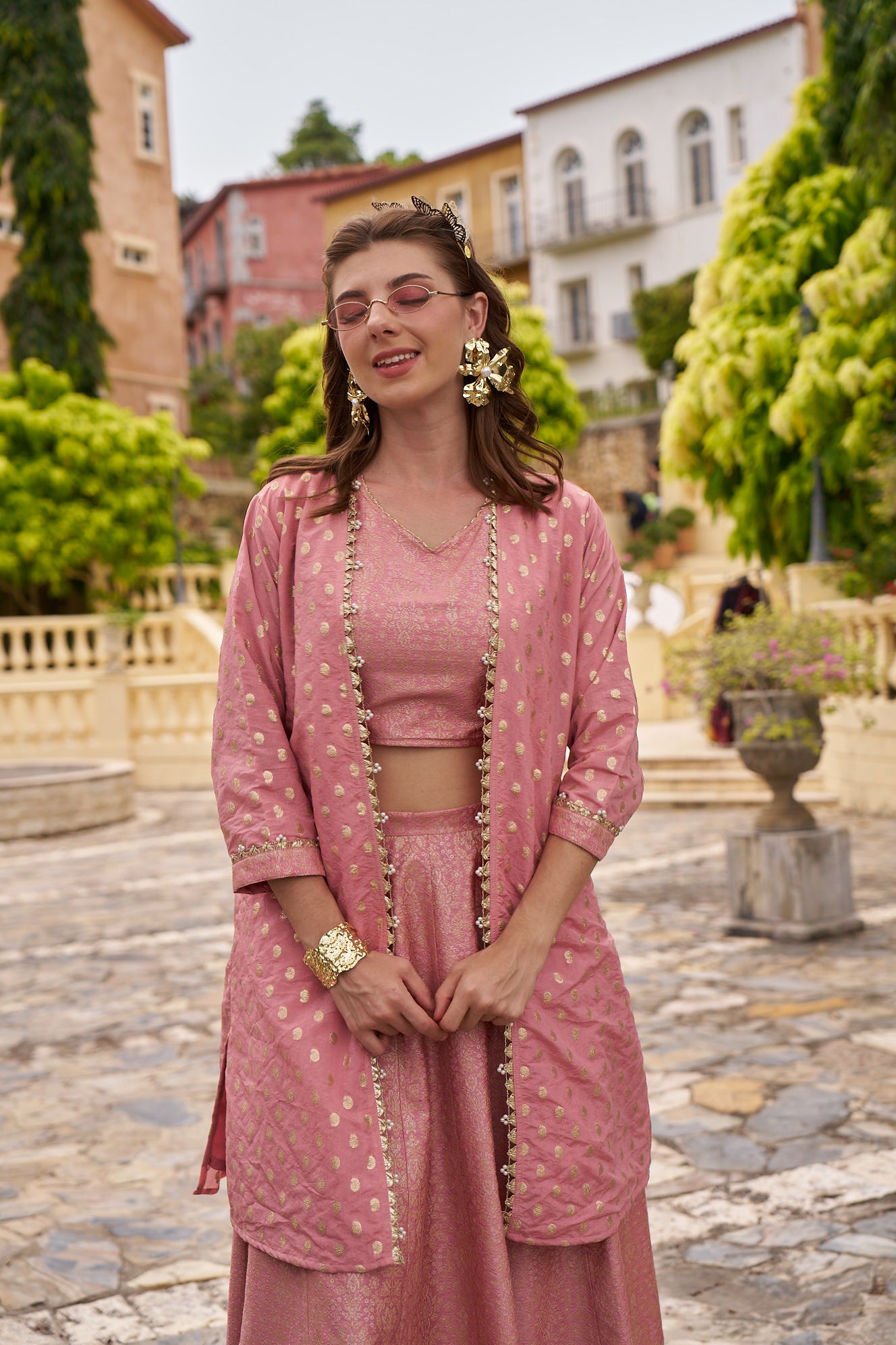 This stylish pink viscose 3-piece set features a chic V-neck printed crop top paired with a matching printed skirt for a coordinated, contemporary look. The printed shrug is elegantly finished with embroidery lace along the border, adding a refined festive touch. Soft, flowy, and beautifully designed, this set is perfect for celebrations and special occasions.