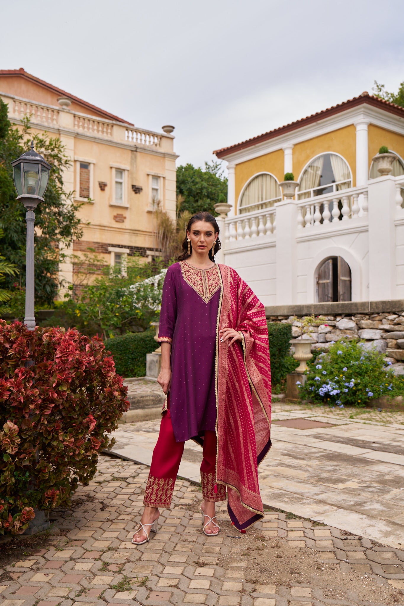 Elevate your festive look with this elegant purple silk kurta set, featuring a classic round neckline adorned with fine embroidery. The matching bottom comes in a contrasting pink shade and is beautifully enhanced with intricate embroidery work for a refined festive touch. The set is completed with a graceful dupatta, making it a perfect choice for celebrations and special occasions.