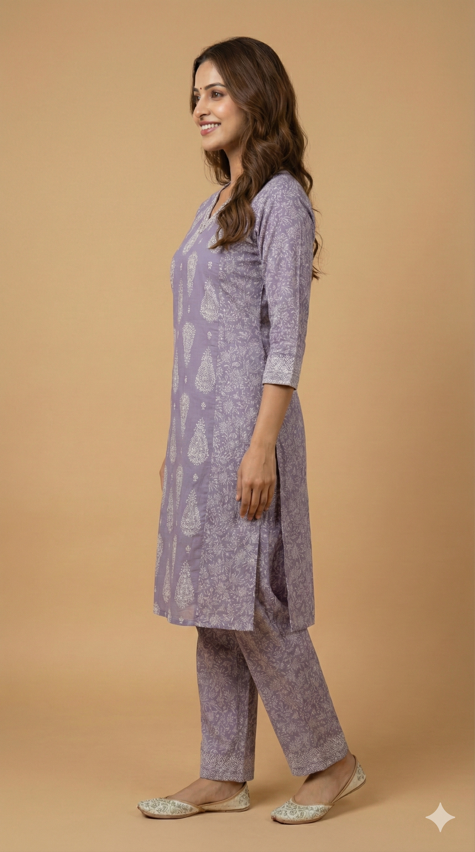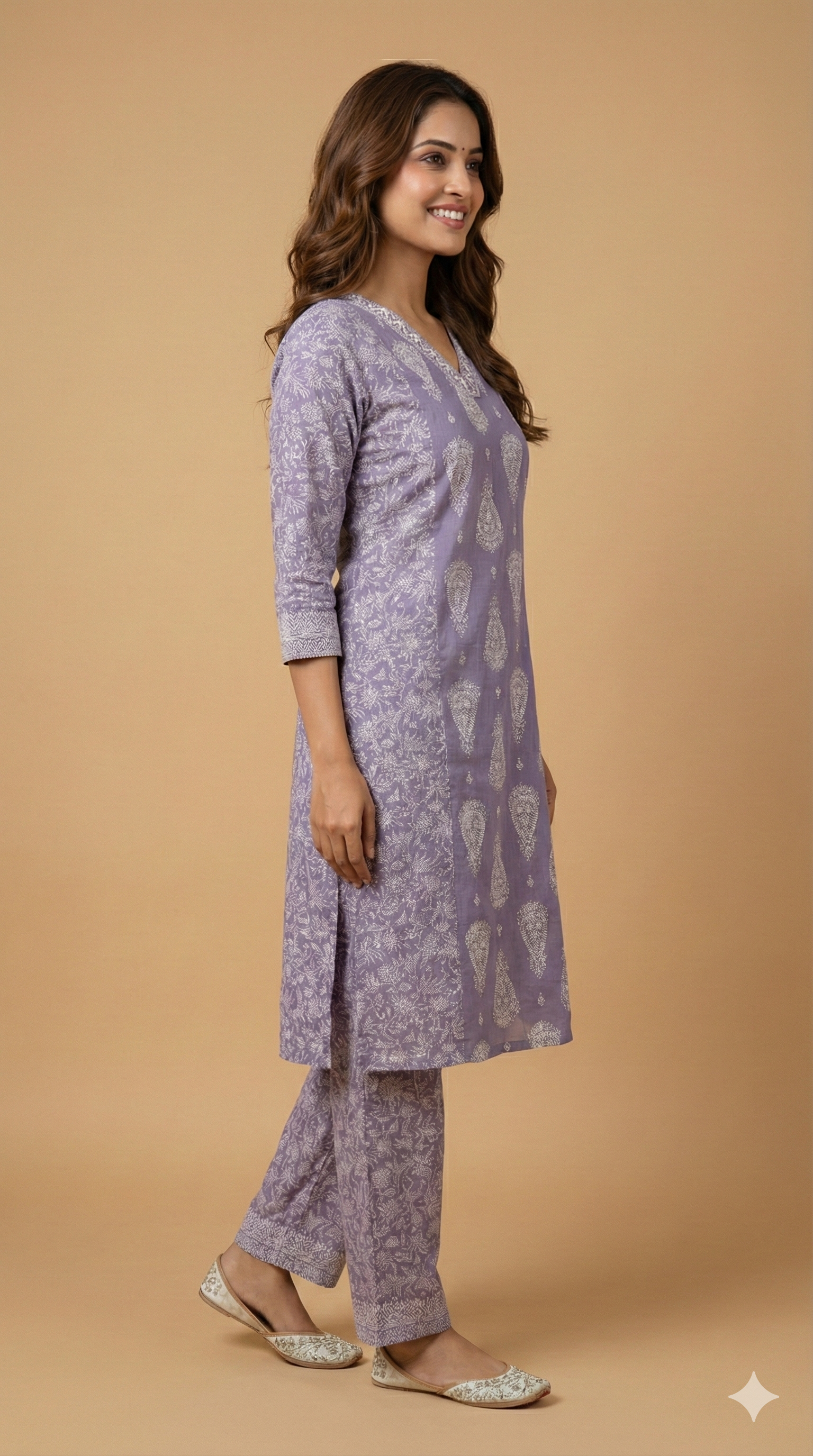Add a touch of effortless charm to your wardrobe with this purple V-neck cotton cord set, perfect for a casual everyday look. The neckline features elegant white prints that beautifully complement the solid-style white print detailing on the outfit. Made from soft and breathable cotton fabric, this set ensures all-day comfort with a stylish finish.