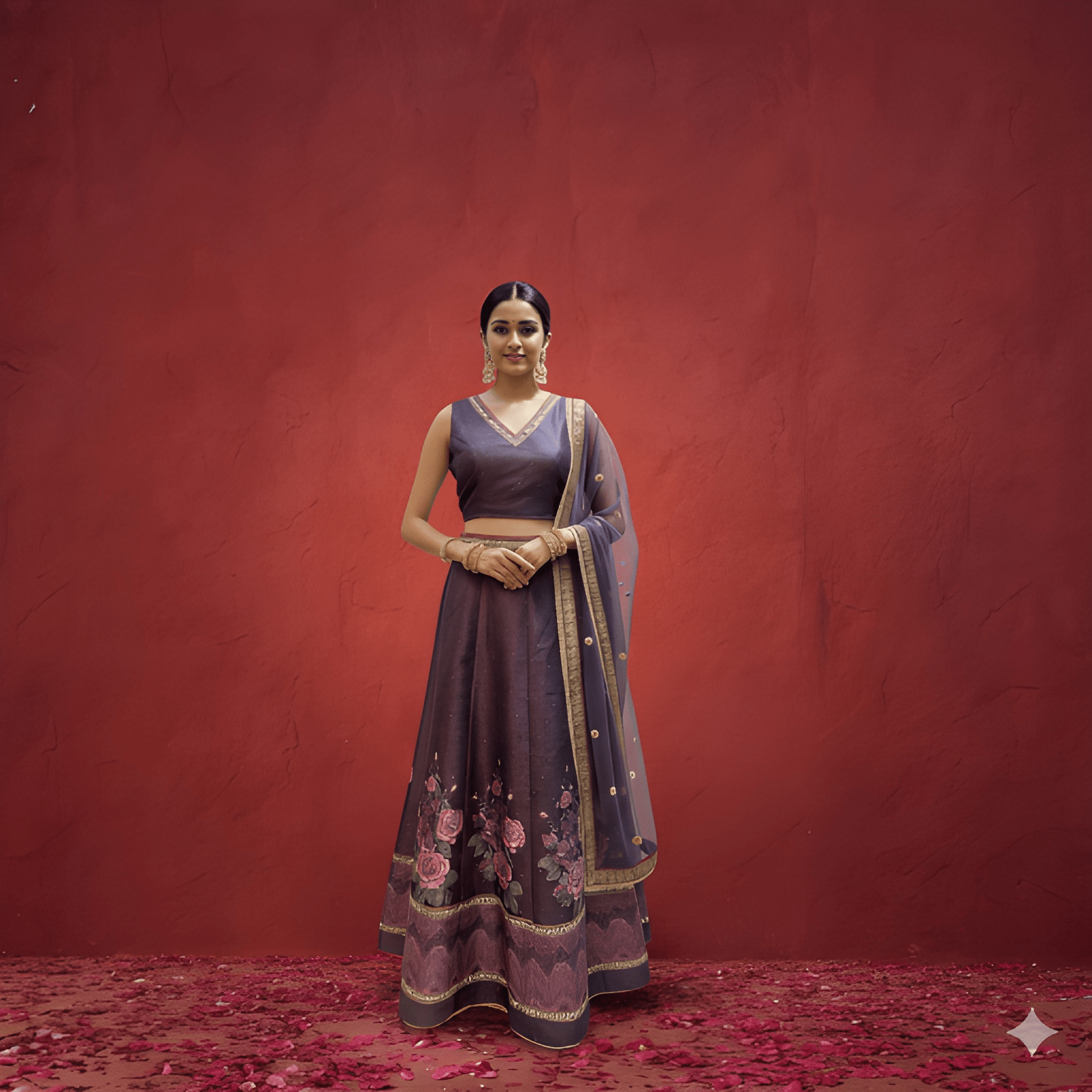 Make a stunning festive statement with this Purple Silk 3PCS Set. The outfit features a sleeveless V-neck crop top paired with a beautifully flowy floral-printed skirt that adds charm and elegance. Completing the ensemble is a soft net dupatta, offering a delicate and graceful finishing touch—perfect for weddings, festive functions, and special celebrations.