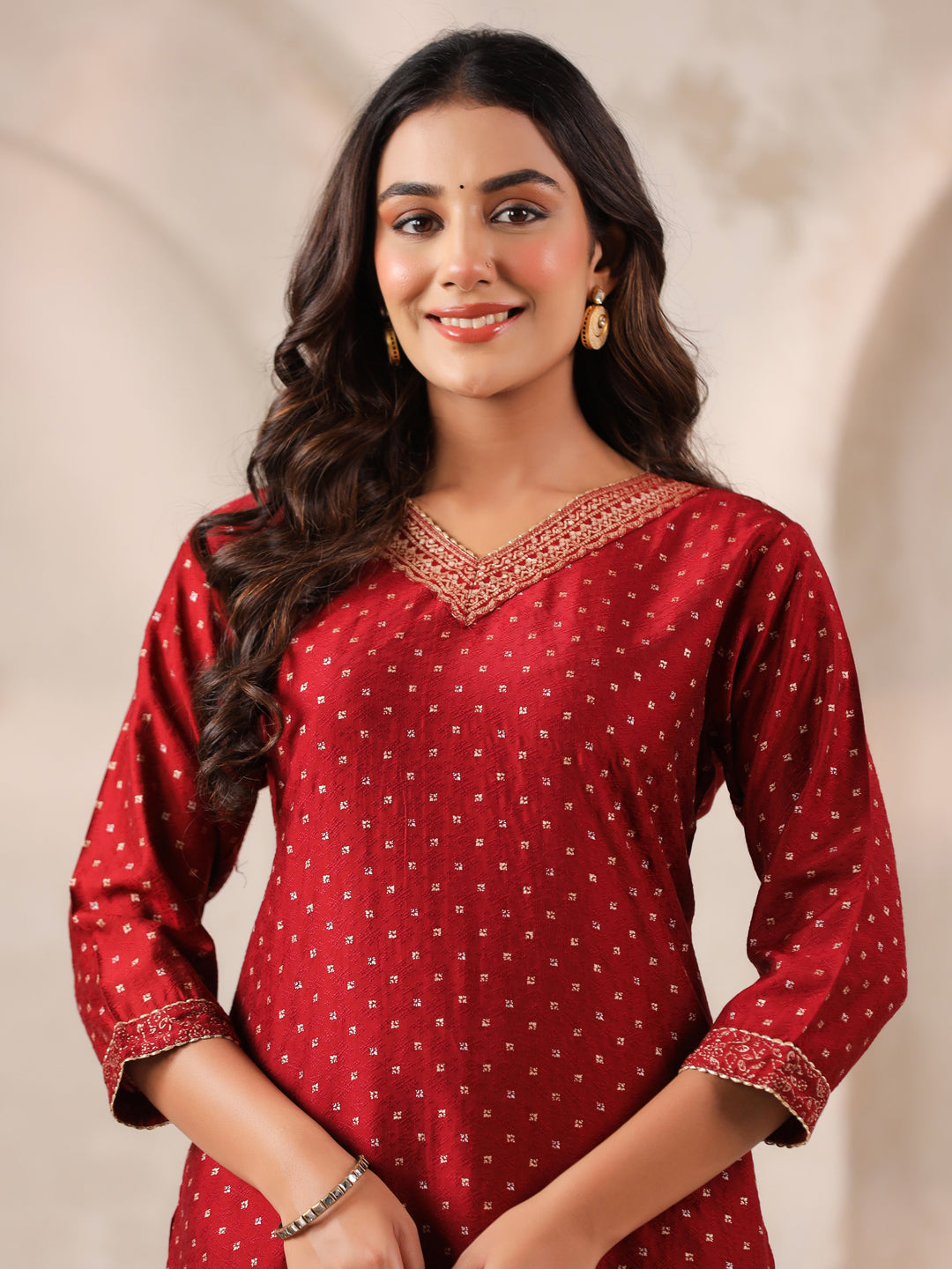 This burgundy V-neck viscose cord set features a stylish kurta with subtle detailing, paired with matching straight pants. Designed for both comfort and elegance, it is a versatile choice for festive occasions as well as everyday wear.