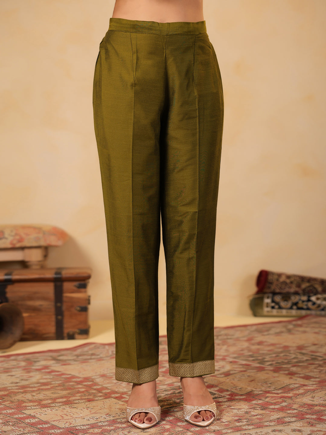 The Span Green Round Neck Silk Kurta Set features intricate embroidery on the neckline and is paired with a beautifully crafted dupatta. Perfect for festive occasions, this set combines elegance and tradition with a touch of modern flair.