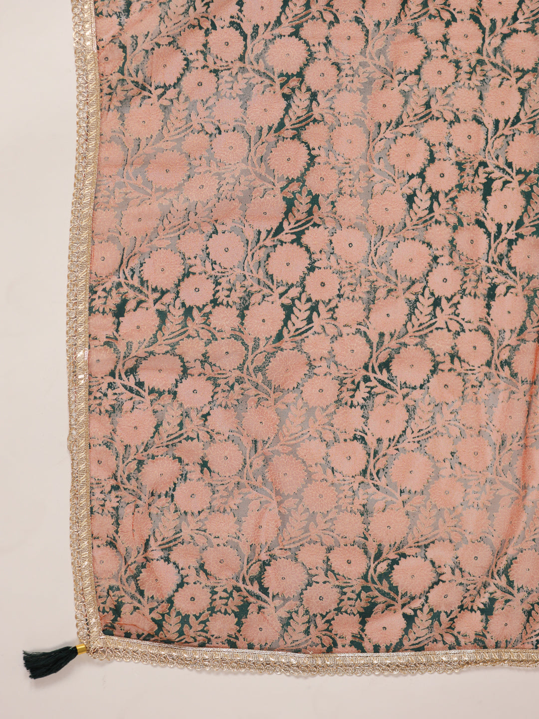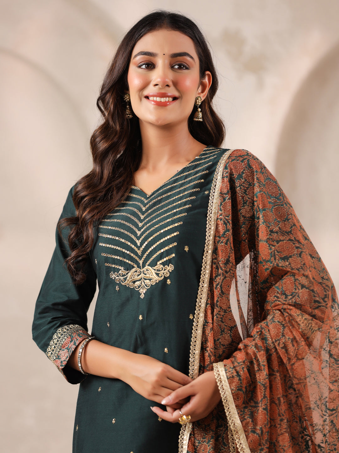 This Green V Neck Silk Kurta Set with Dupatta exudes elegant festive charm. The kurta features delicate golden thread embroidery on the neckline along with scattered buti work, paired with matching straight pants adorned with a contrast border. The set is completed with a printed dupatta highlighted with intricate patterns and a complementing border, making it a perfect choice for festive and special occasions.