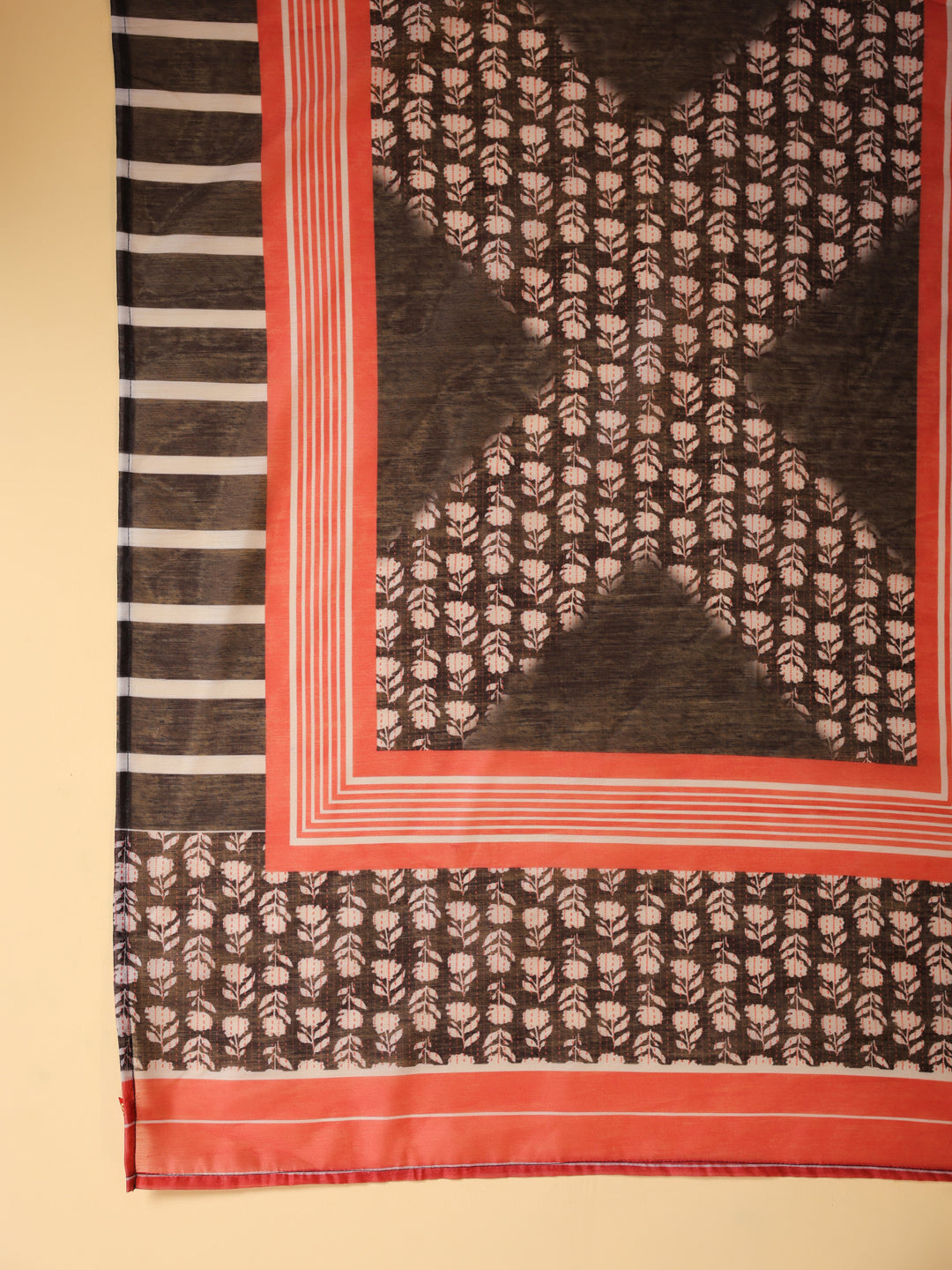 This grey round-neck cotton kurta set offers a perfect blend of comfort and style. The kurta features subtle black floral detailing at the borders, while the striped dupatta adds a bold contrast. Paired with matching wide-leg pants, it's an ideal choice for casual or semi-formal occasions.