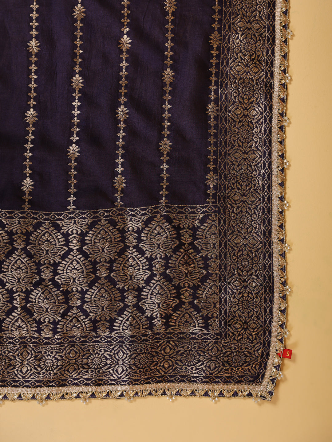 The Span Ivory Gown Set is a graceful 2-piece ensemble featuring a beautifully embellished gown paired with a rich purple dupatta. Perfect for festive occasions, this set combines simplicity and elegance with intricate detailing for a sophisticated look.