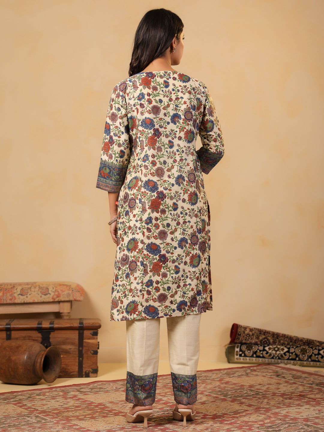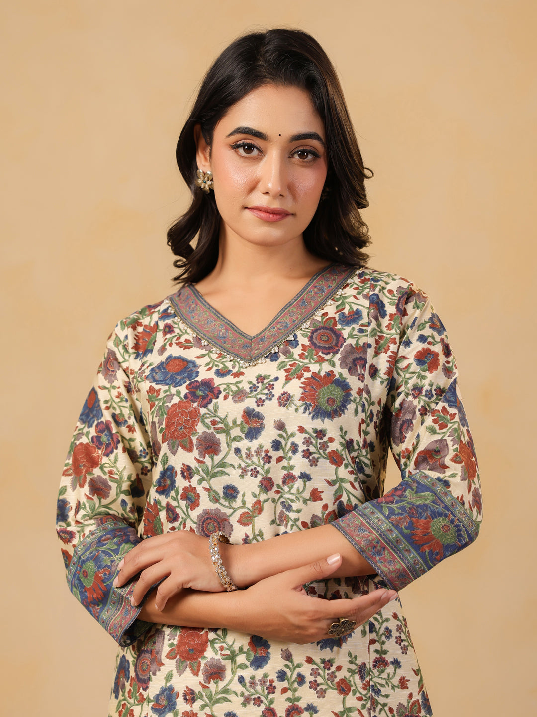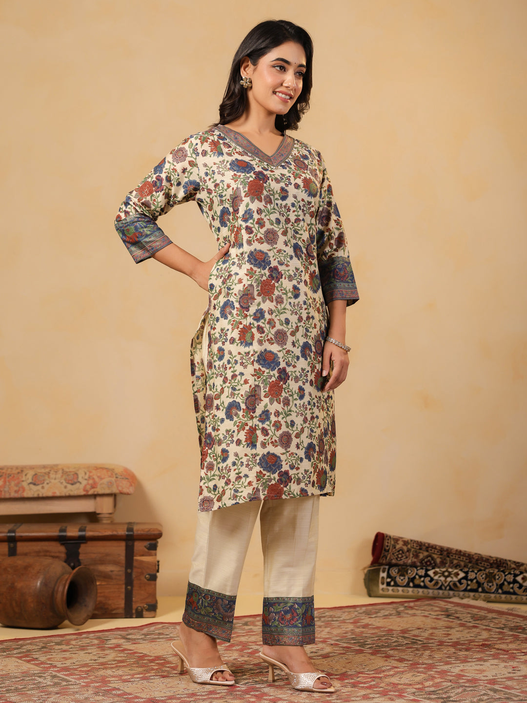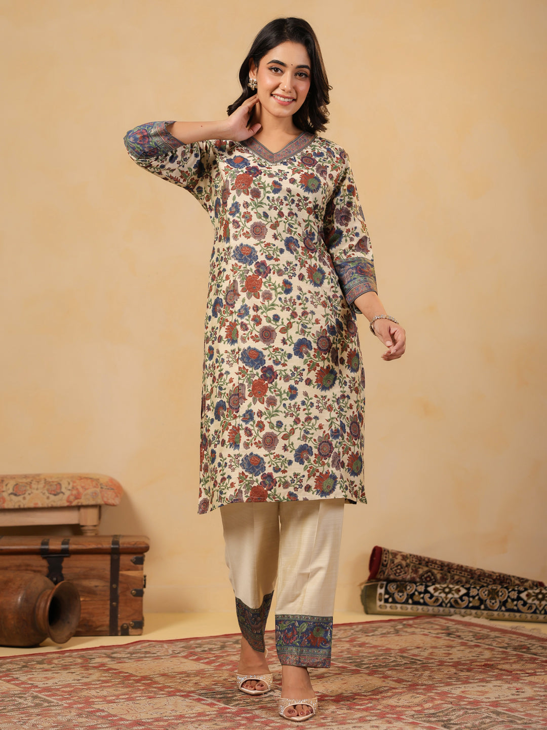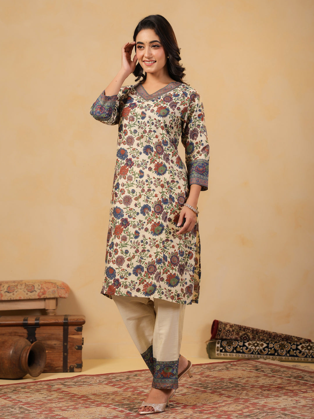 Ivory V Neck Silk Cord Set featuring vibrant floral prints, contrast border detailing on neckline, sleeves, and hemline for a festive look. Paired with matching ivory pants adorned with printed borders for an elegant finish.