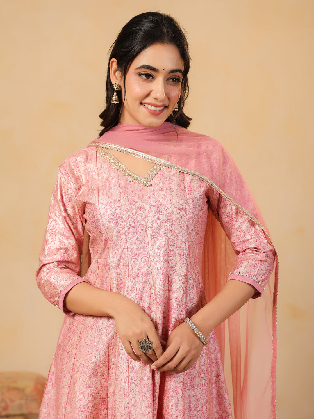 Span Pink V Neck Viscose Kurta Set with Dupatta