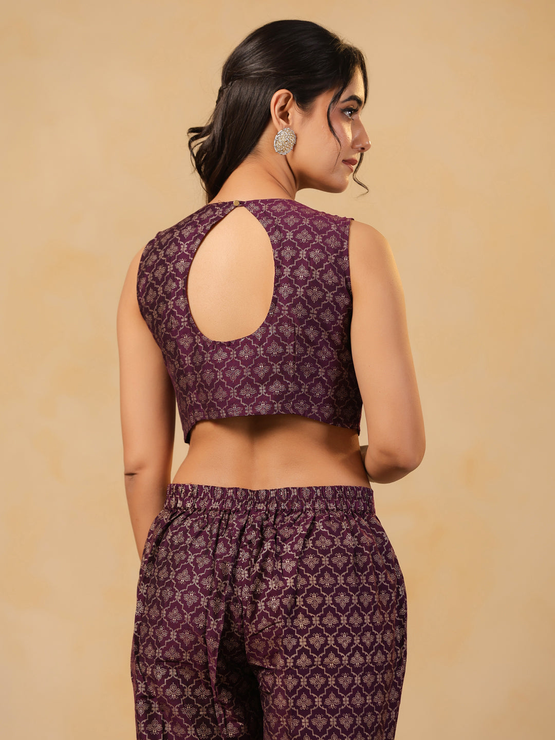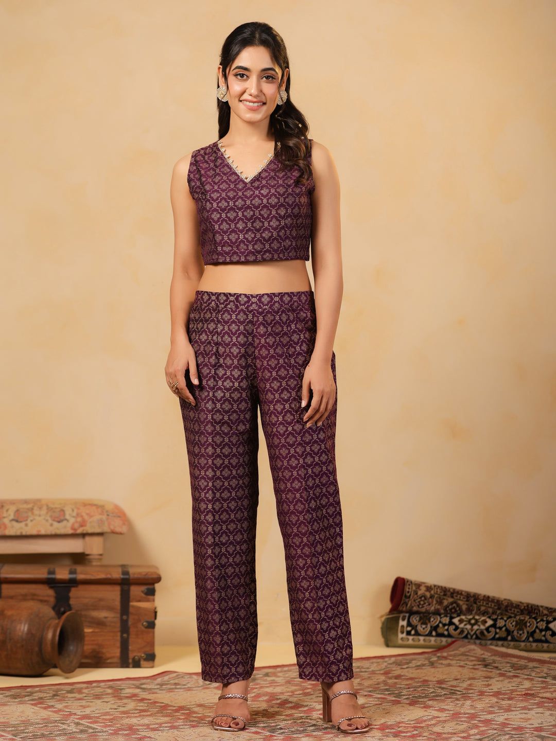 The Span Purple V-Neck Silk Jacket Set is a festive fit that includes a stylish jacket, a matching crop top, and elegant pants. Perfect for celebrating in chic, modern style, this 3-piece set blends luxury with sophistication.