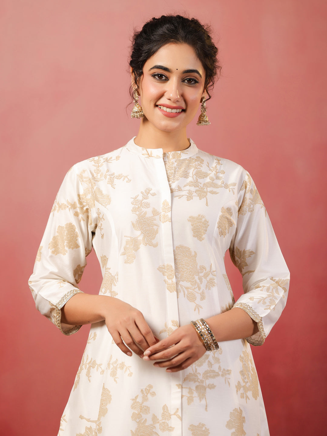 White Mandarin Neck Silk Cord Set featuring a sleek mandarin collar with delicate detailing, paired with matching straight pants. A refined and elegant choice, perfect for festive and formal occasions.