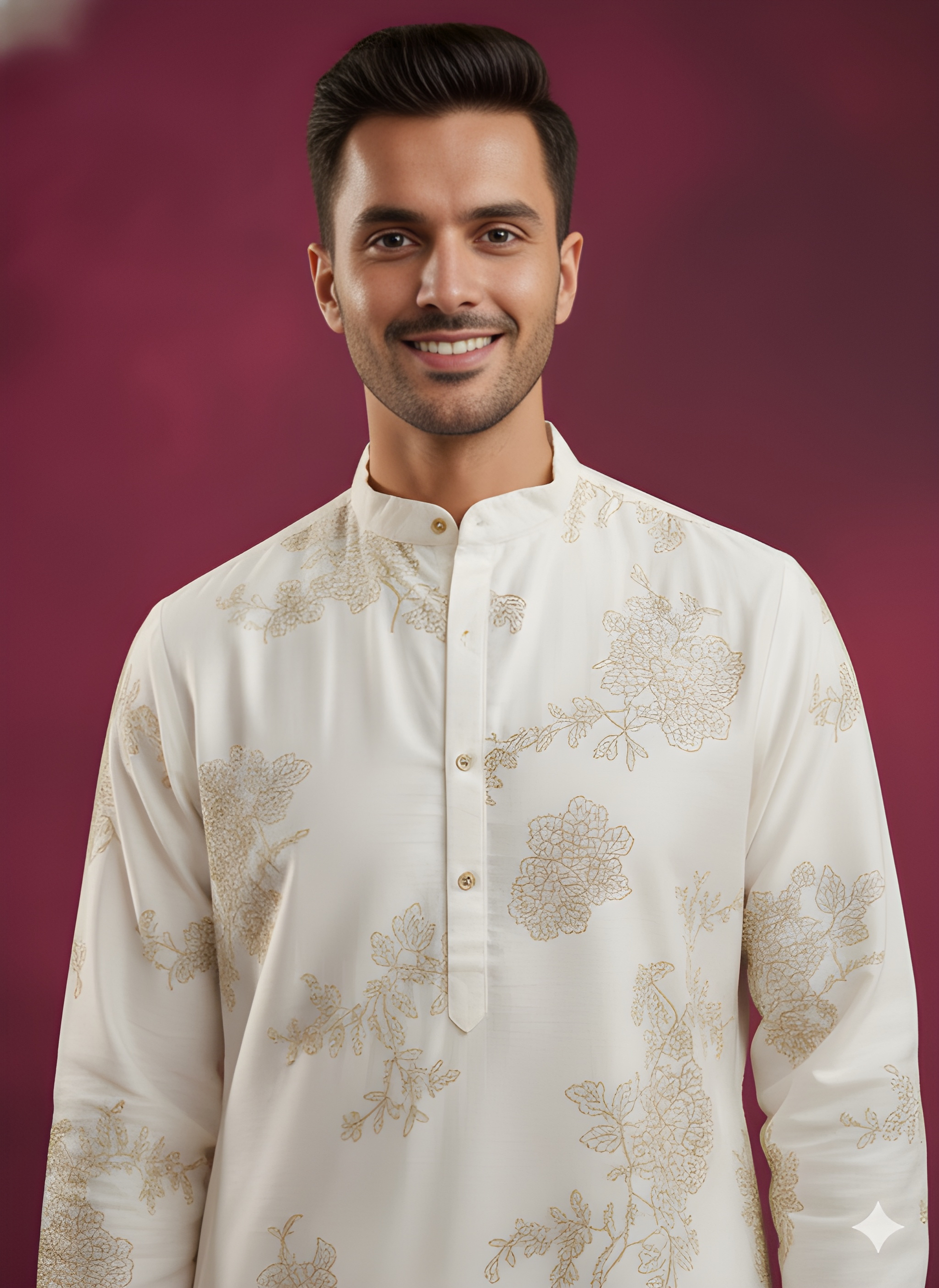 This White Mandarin Neck Silk Kurta exudes festive elegance with its rich silk fabric and beautiful gold print detailing. The mandarin neckline adds a refined touch, making it perfect for celebrations and special occasions. A classy and timeless piece that brings effortless festive charm to your look.