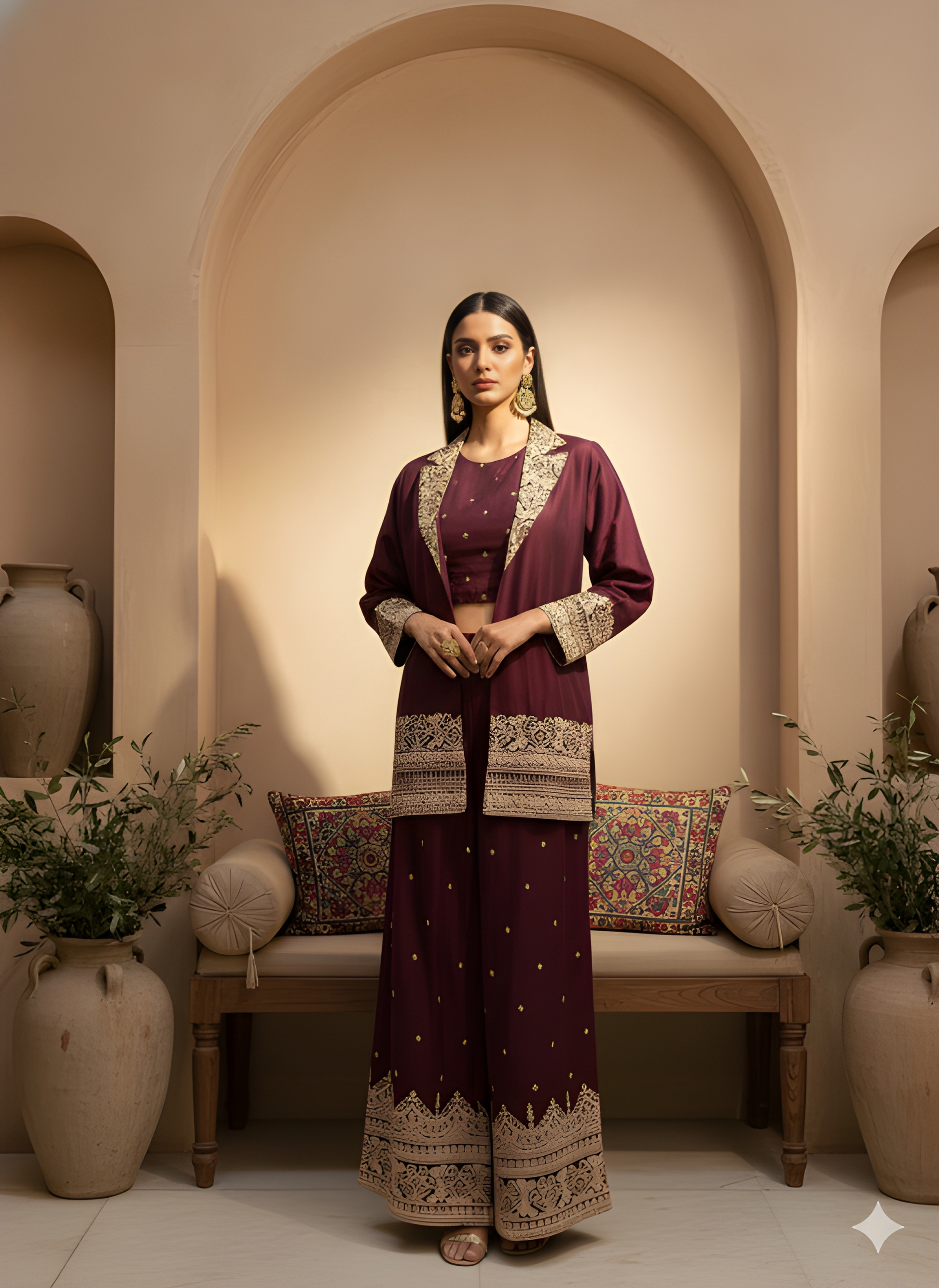 This stylish 3-piece set features a round-neck silk crop top paired with a jacket-collar style shrug for a modern festive look. The palazzo bottom adds comfort and flair, enhanced with an embroidered border for an elegant touch. Perfect for festive occasions, this set beautifully blends tradition with contemporary style.