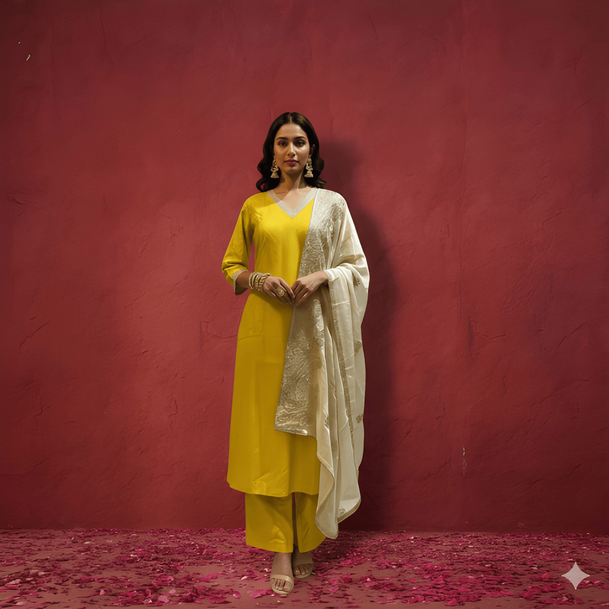 Brighten up any festive moment with this stunning Yellow Viscose Kurta Set. Featuring a stylish round V-neckline, the kurta offers a graceful fit with a soft, smooth drape. Paired with a matching bottom and a coordinating dupatta, this ensemble brings together elegance and comfort, making it perfect for festive celebrations, family gatherings, and special occasions.